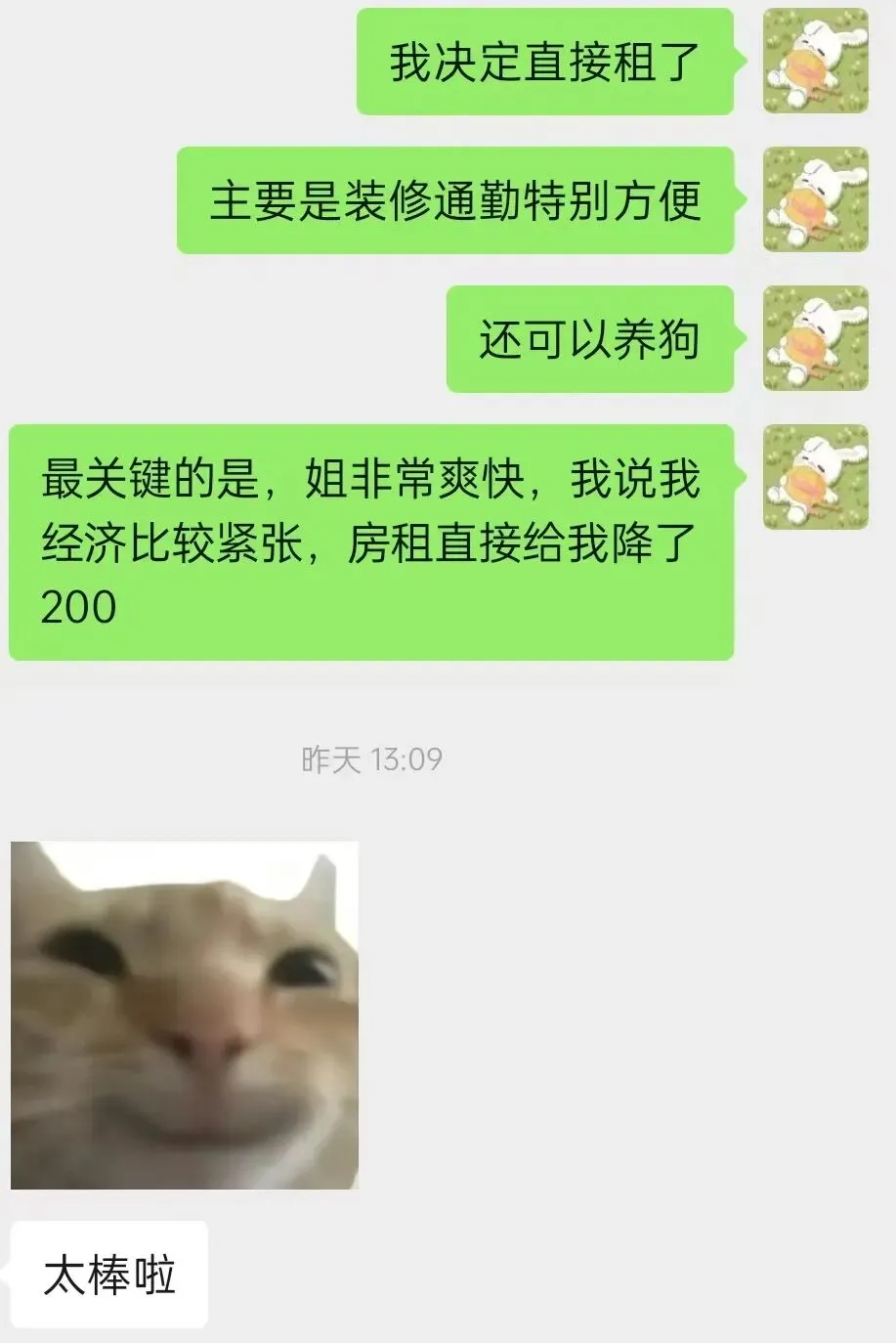 结果房东阿姨一秒答应,说我们说话做事爽快她很喜欢,直接给我们房租降了二百,说明年租期到了,还要续租的话给我们免个把月房租。