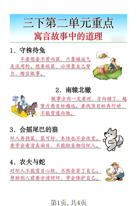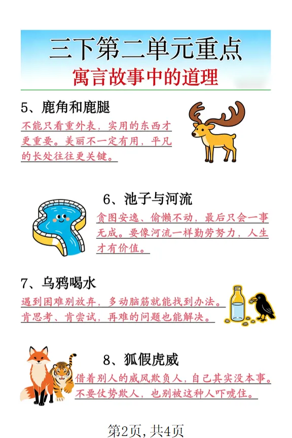 【免费下载】三年级(下)语文 第二单元寓言故事道理,PDF电子版,可打印,共4页,先保存,以免资源失效