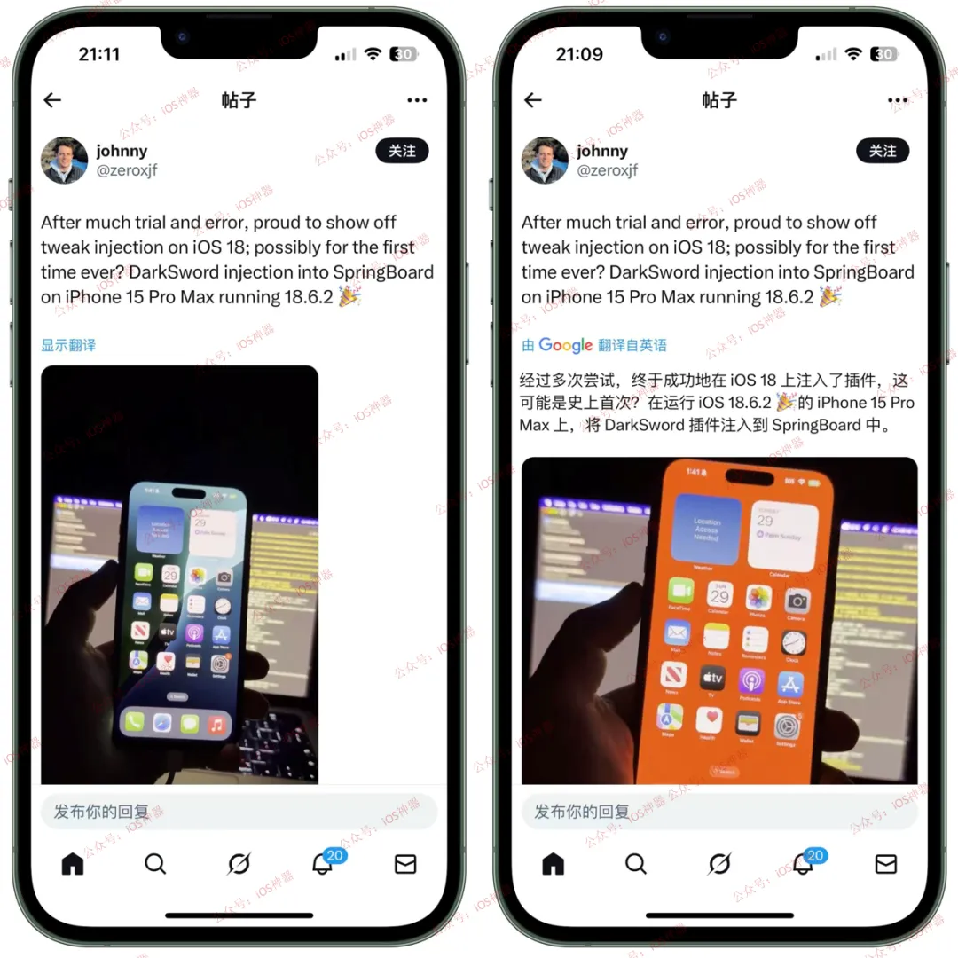 hi果粉们,好消息!今天有开发者在iOS18.6.3的 iPhone 15 Pro Max上「成功注入插件」。