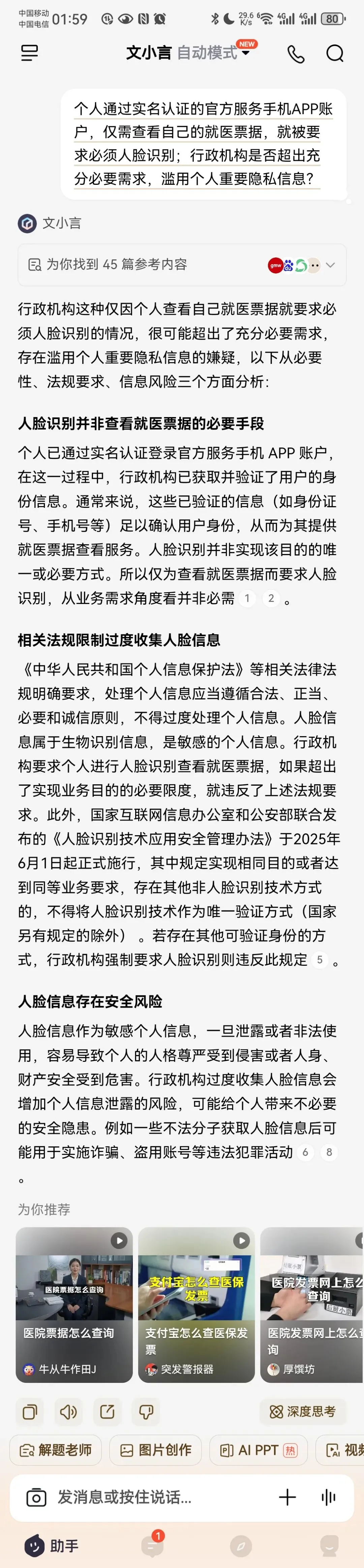 首先,仅为此需求就必须要求人脸识别属于违规行为,具体看阿里的通义千问和百度的文小言两个人工智能的回答,见图3、图4;不再赘述。