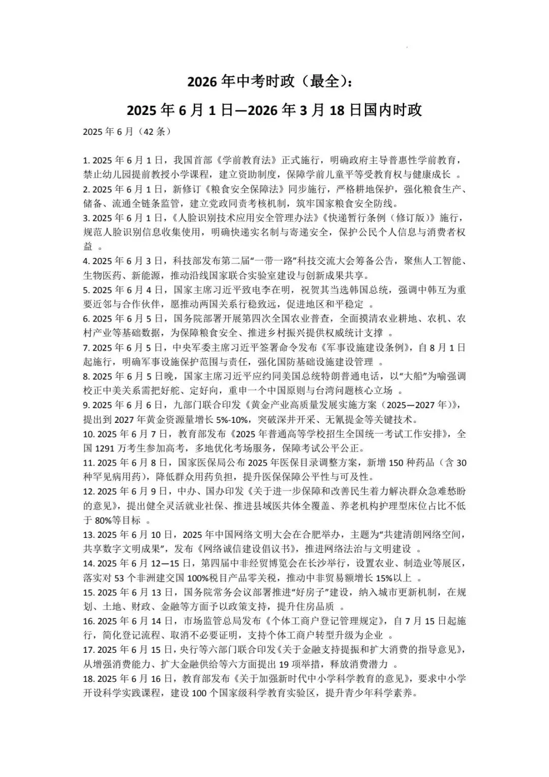 2026年中考时政最全 可打印。末尾有免沸电子打印版领取方法。按需保存