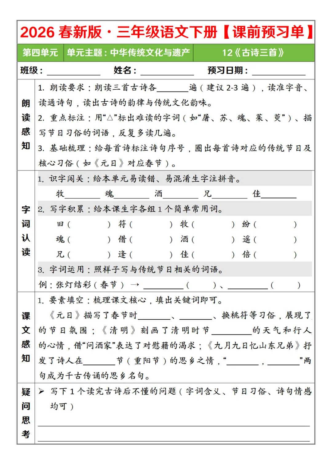 【免费下载】三年级(下)语文 26春第四单元课前预习单,PDF电子版,可打印,共5页,先保存,以免资源失效