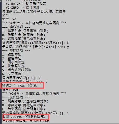 YC-INFO:统计模式,用于查看筛选结果的数量和类型样本,不执行隔离/隐藏。