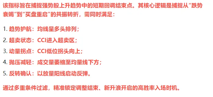 信号过滤:=FILTER(CCI超卖 AND CCI拐头 AND 缩量企稳 AND 量能放大 AND 均线多头 AND 价格强势,10);