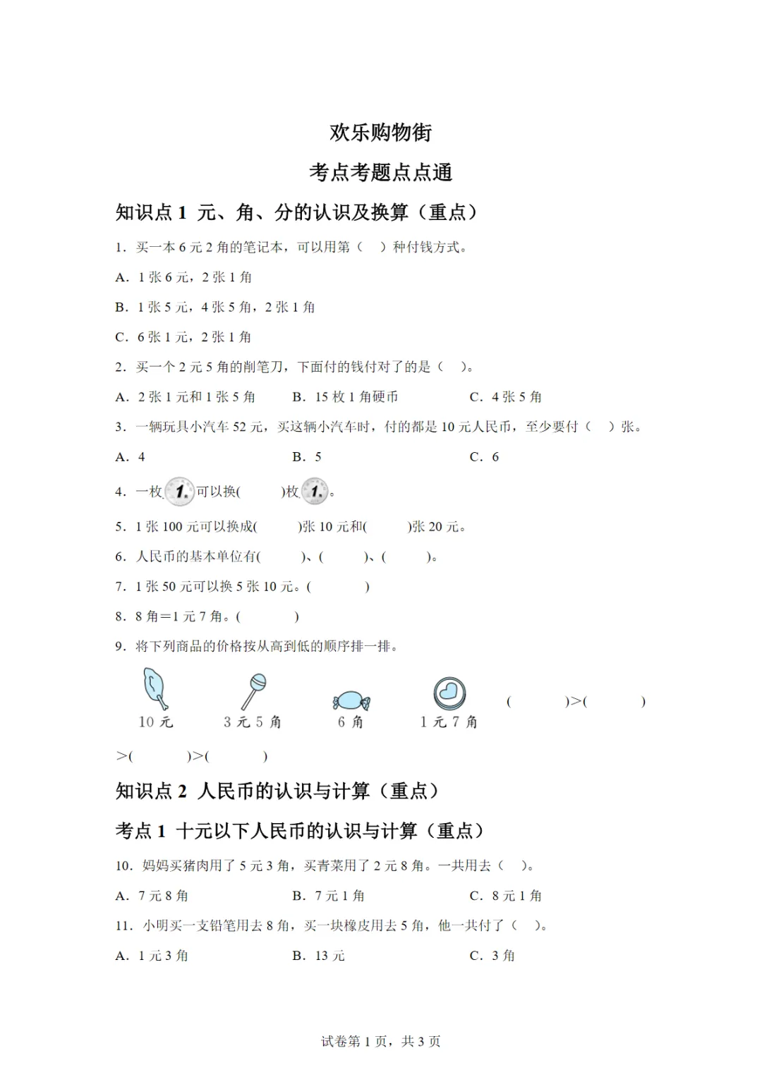 【高清电子版】新教材人教版一年级下册数学欢乐购物街考点考题点点通