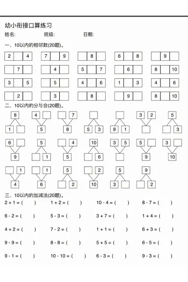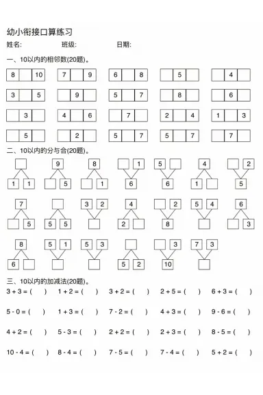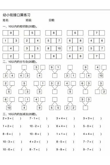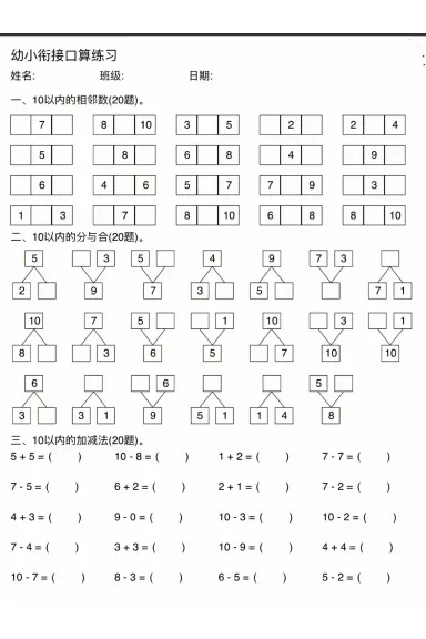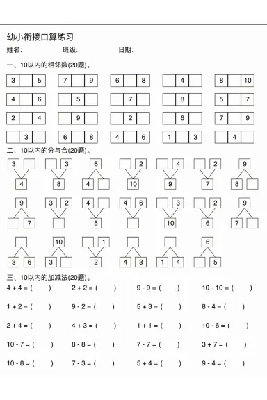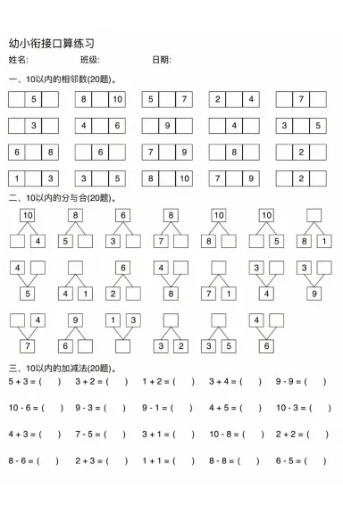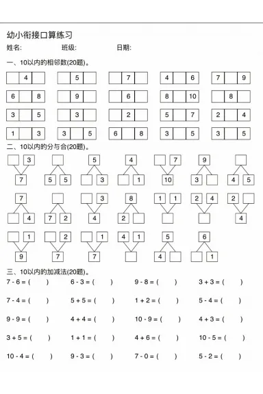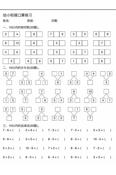 幼小衔接口算总出错?10 以内加减法、分与合、相邻数总记混?这份口算练习太实用!涵盖 10 以内相邻数、分与合、加减法,题型简单重复,每天 10 分钟针对性练,帮孩子夯实计算基础,提升口算速度,幼升小数学不费力~