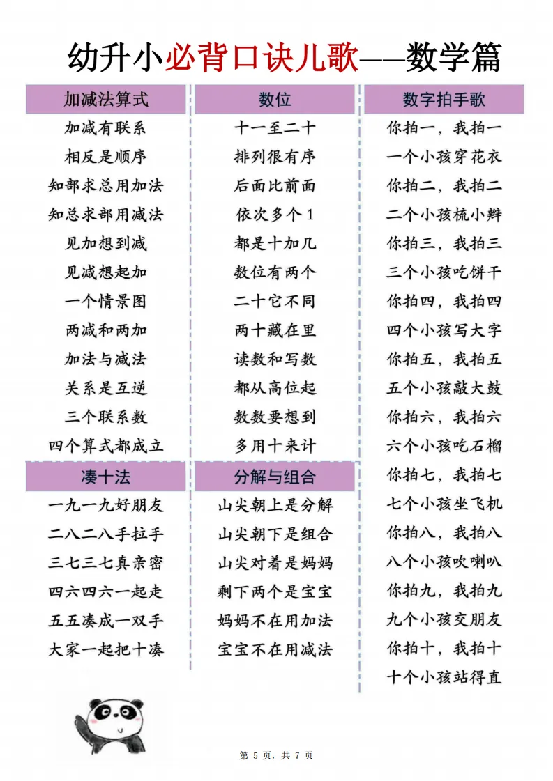 孩子学数学枯燥抵触?这份口诀儿歌太好记!凑十法、相邻数、人民币、方位等知识点全编成朗朗上口的儿歌,搭配手势歌、数字歌,孩子边唱边学,轻松记住数学重点,为幼升小打牢基础~