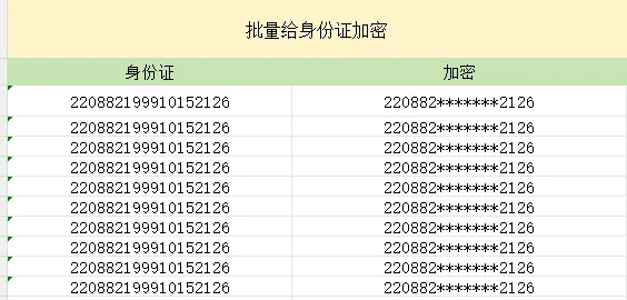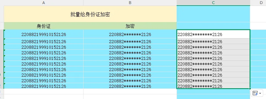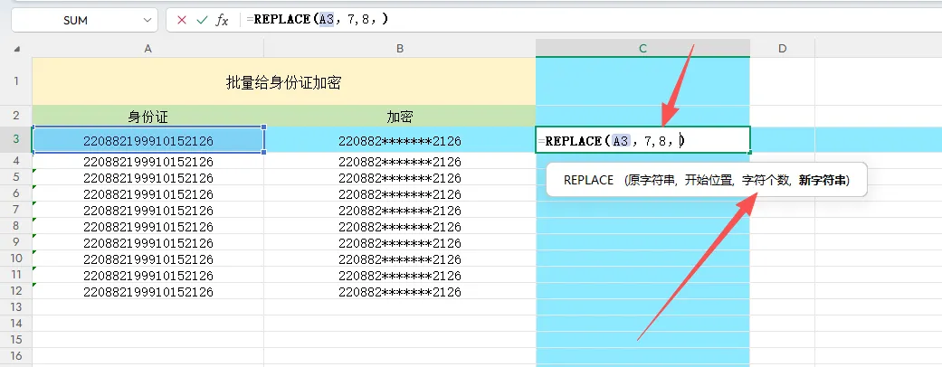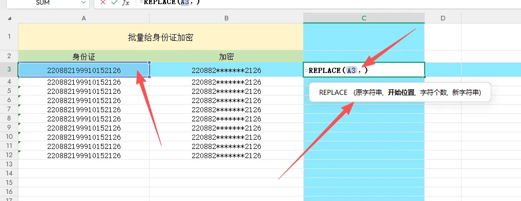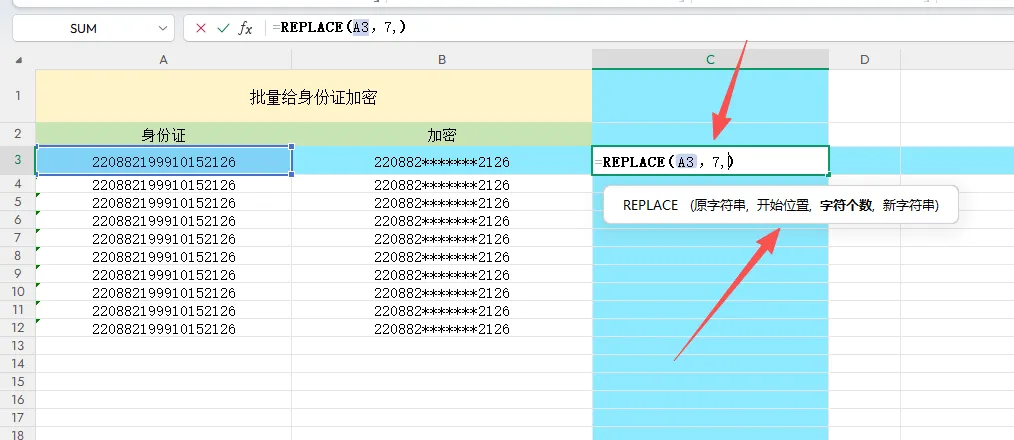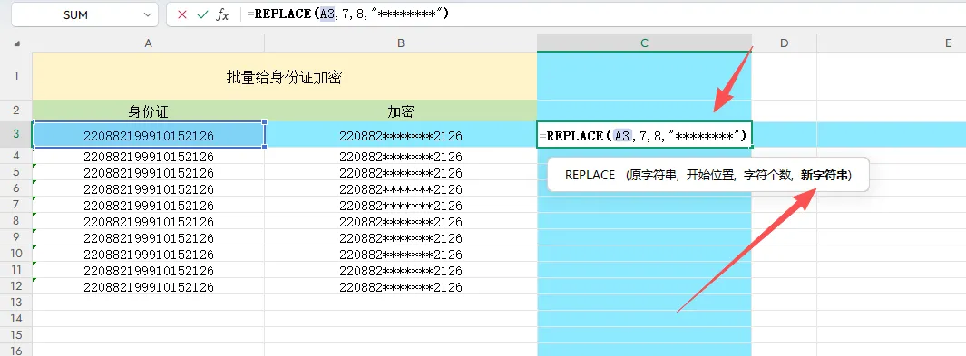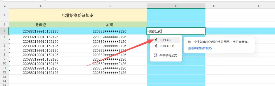 WPS表格里如何批量给身份证加密显示? 本期分享下如何给表格里的身份证号码设置加密显示,希望能帮助到有需要的伙伴↓ 本期用到的函数REPLACE 在表格内输入=REPLACE双击选择这个函数↓ 原始字符这里,我们点击要加密的单元格,之后输入逗号↓ 接下来开始位置这里,输入数字7→逗号↓(意思是从第7位开始) 然后是字符个数,我们输入8→逗号↓(意思是8位数) 最后是新字符串,我们输入双引号(需要注意要在英文输入法状态下的双引号)在双引号内输入8个星号,之后按下回车键即可↓ 接下来将鼠标移动到已经完成的文本框右下角,光标变成加号后双击即可批量完成操作↓ 点击最上方蓝字她与玫瑰茶 加个关注,一起进步~