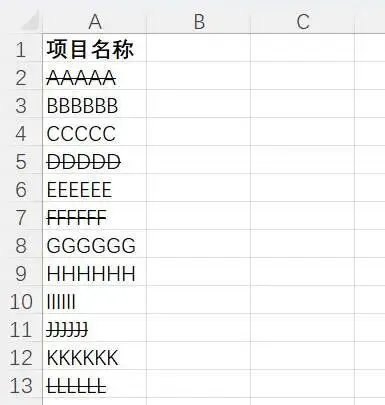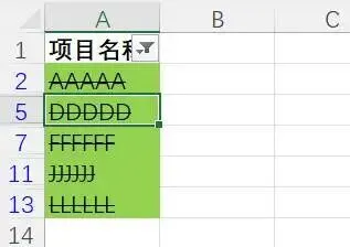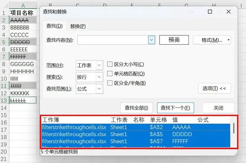可以看到,列A中所有包含删除线的单元格都被选中了。