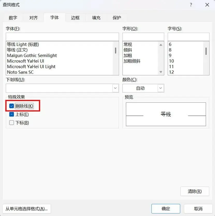 出现“查找格式”对话框,勾选其中的“删除线”复选框,如下图4所示。单击“确定”。