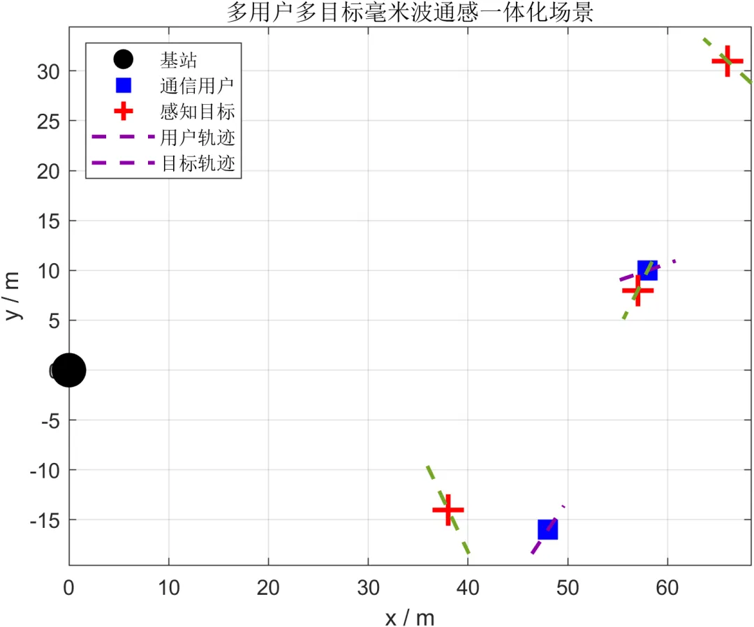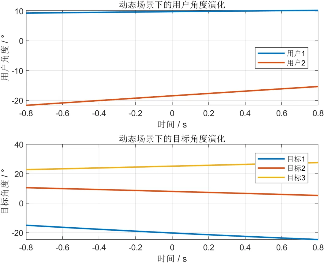 为增强系统模型的真实性,本文在静态几何基础上加入动态场景建模。通信用户与感知目标均具有各自的运动轨迹,其相对于基站的位置变化会引起角度、距离和径向速度的连续变化。这一过程直接影响波束指向、信道匹配程度以及多普勒谱特征,因此对于通感一体化系统而言,动态场景不仅改变感知对象本身的可观测特性,也会反向影响通信端的资源配置与波束设计策略。