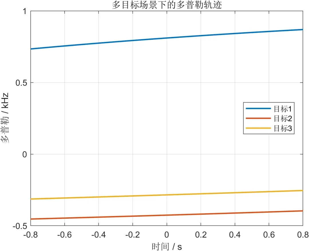 多普勒信息是衡量目标运动状态的重要依据,也是速度估计精度分析的关键基础。本文通过动态几何关系计算目标随时间变化的速度投影,得到多目标场景下的多普勒演化轨迹,并将其纳入综合感知分析框架。相比于静态单点分析,动态多普勒建模能够更真实地反映系统在连续观测条件下的性能变化趋势。