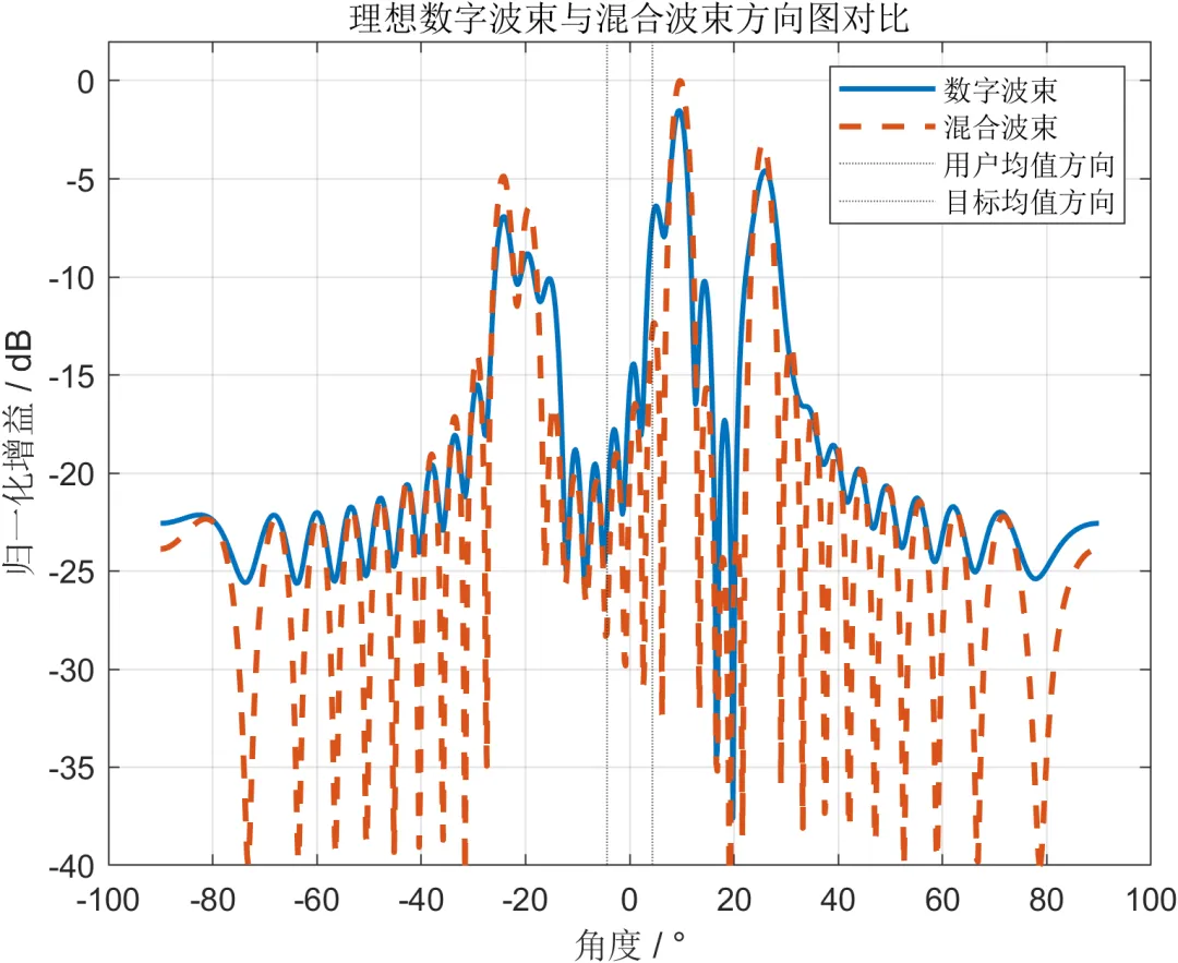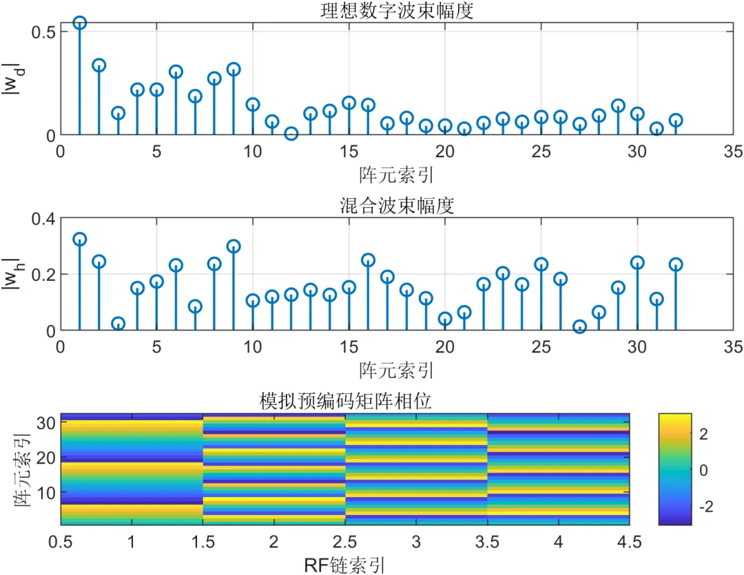 在波束成形方面,理想数字波束通常能够提供更强的自由度,但在毫米波系统中往往意味着较高的射频链数量和实现成本。因此,本文进一步构建混合波束成形模型,通过模拟预编码矩阵和数字组合权重的协同,逼近理想数字波束的方向图特性。仿真中不仅比较两者的主瓣对准效果和旁瓣结构,还对混合波束中的权重幅度和相位分布进行可视化分析,以体现硬件约束下波束设计的实际特征。