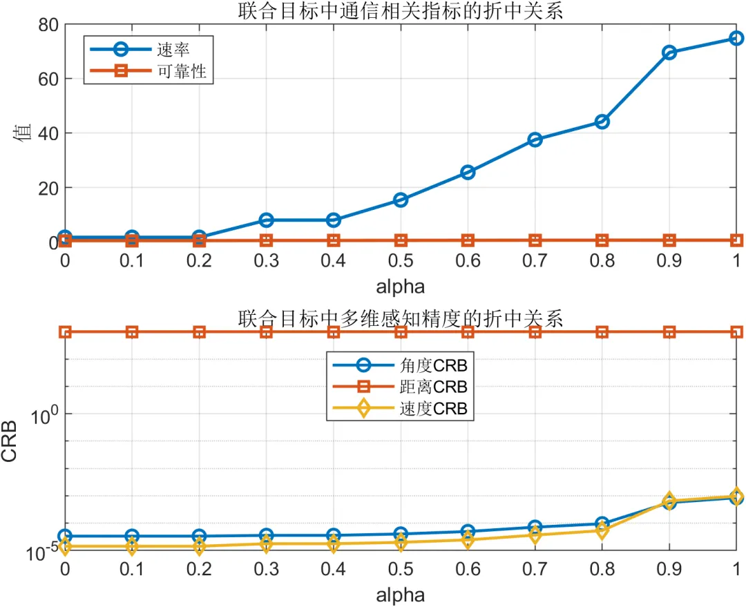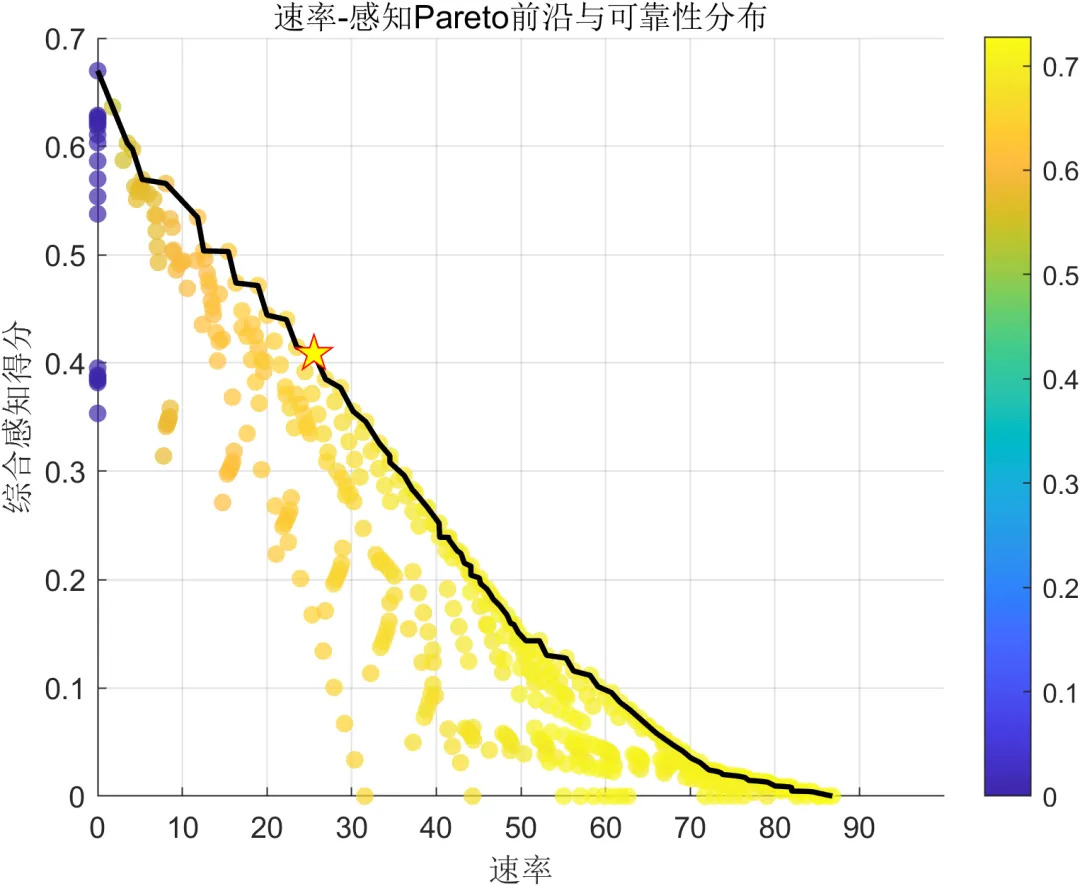 从 Pareto 前沿结果来看,通信速率与综合感知得分之间存在明显的此消彼长关系。随着系统将更多资源倾斜至通信侧,速率提升较为显著,但综合感知得分会逐渐下降;反之,当更多资源向感知侧分配时,感知性能得到改善,而通信能力则趋于减弱。这一结果表明,在通感一体化系统中不存在在所有指标上同时占优的单一方案,联合优化的意义正在于在不同性能维度之间找到符合任务需求的平衡点。