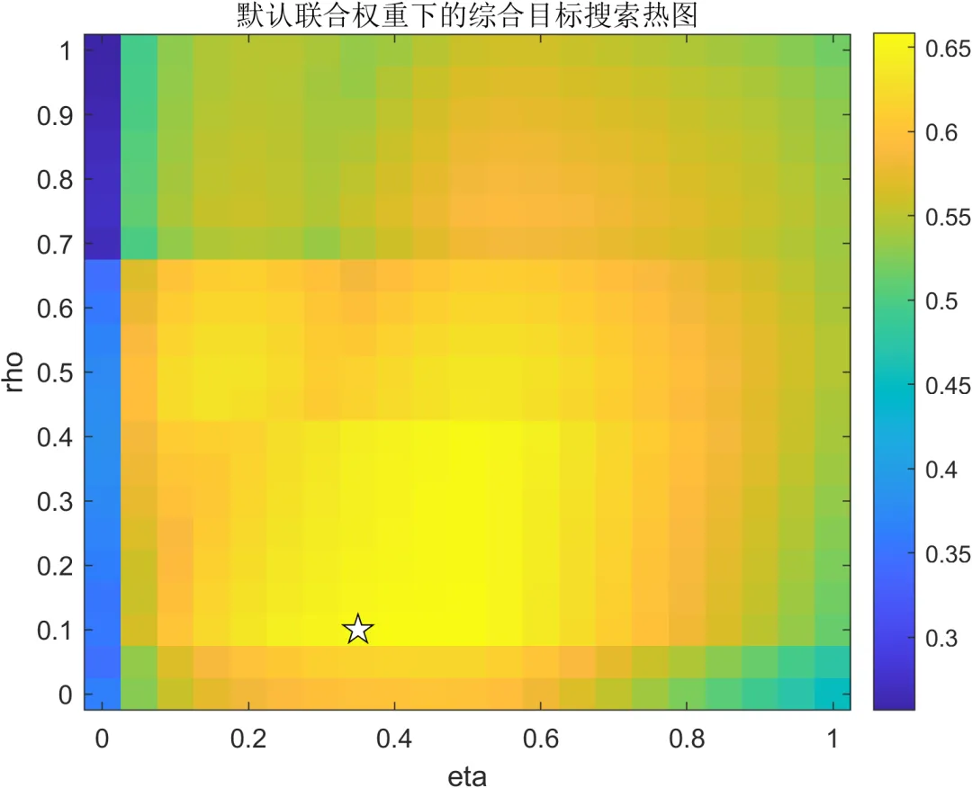 本文采用综合目标驱动的联合设计思路,在优化过程中同时纳入通信速率、通信可靠性和多维感知指标,并通过权重参数控制不同性能侧重点。与单纯线性叠加不同,联合设计更加注重多指标之间的协调关系,使系统不至于因为某一指标的极端占优而造成其他指标的急剧恶化。为此,本文在参数扫描基础上构建联合目标搜索热图,并据此寻找不同资源比例和权重配置下的候选最优解,再通过 Pareto 前沿提取方法刻画速率与综合感知之间的性能边界。