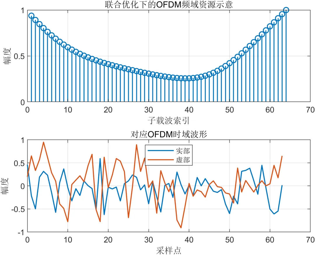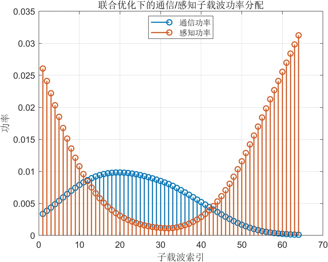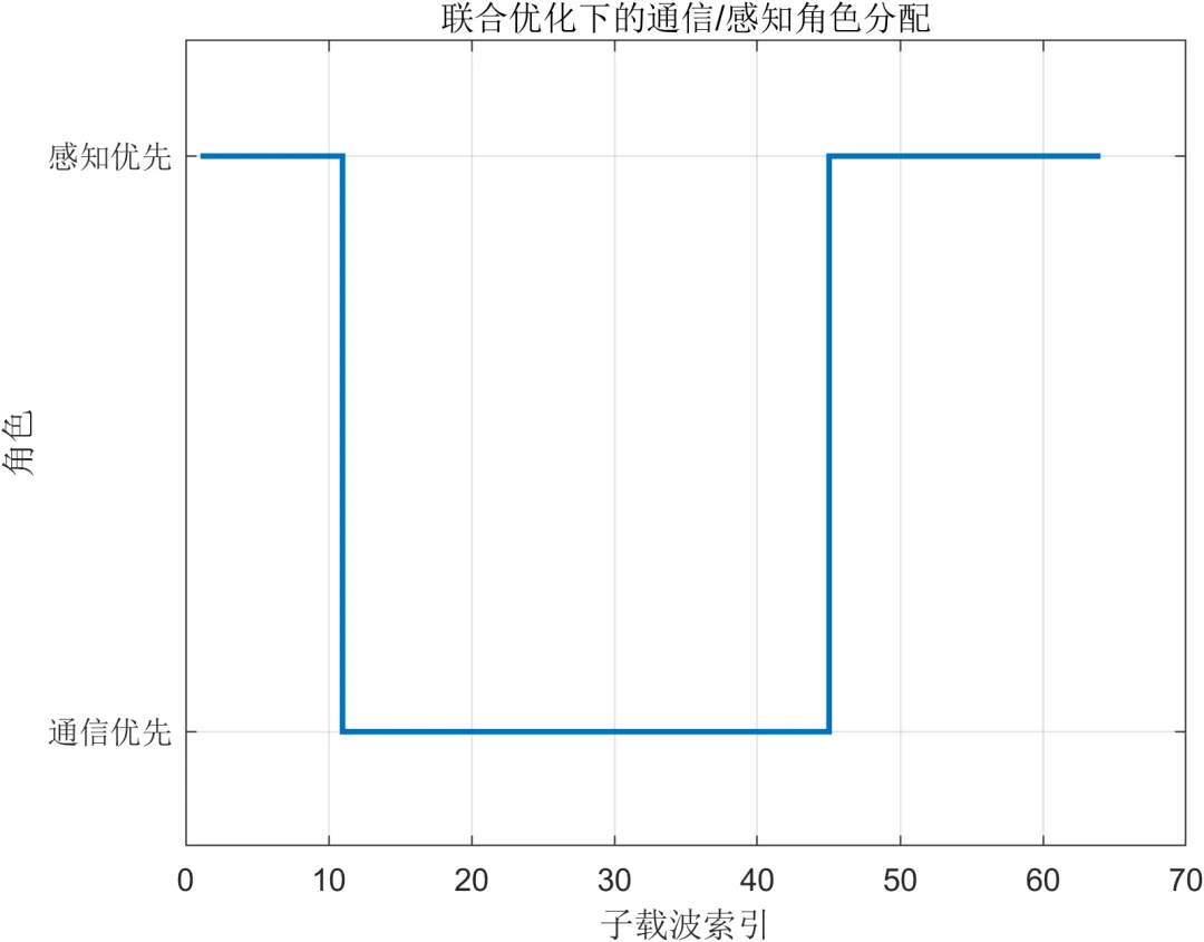 从频域资源角度看,本文将 OFDM 子载波视为可调度资源单元,不同子载波可以被赋予通信优先或感知优先的角色。一般而言,中部子载波更适合保证通信传输稳定性,而边缘子载波在提升距离分辨相关能力方面更具价值。基于这一特点,本文在角色划分和功率分配时并非简单平均分配,而是结合通信需求和感知需求对各子载波进行差异化加载,使系统频域资源呈现结构化而非完全均匀的分布形态。