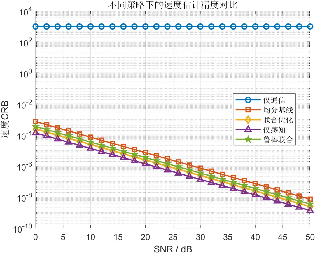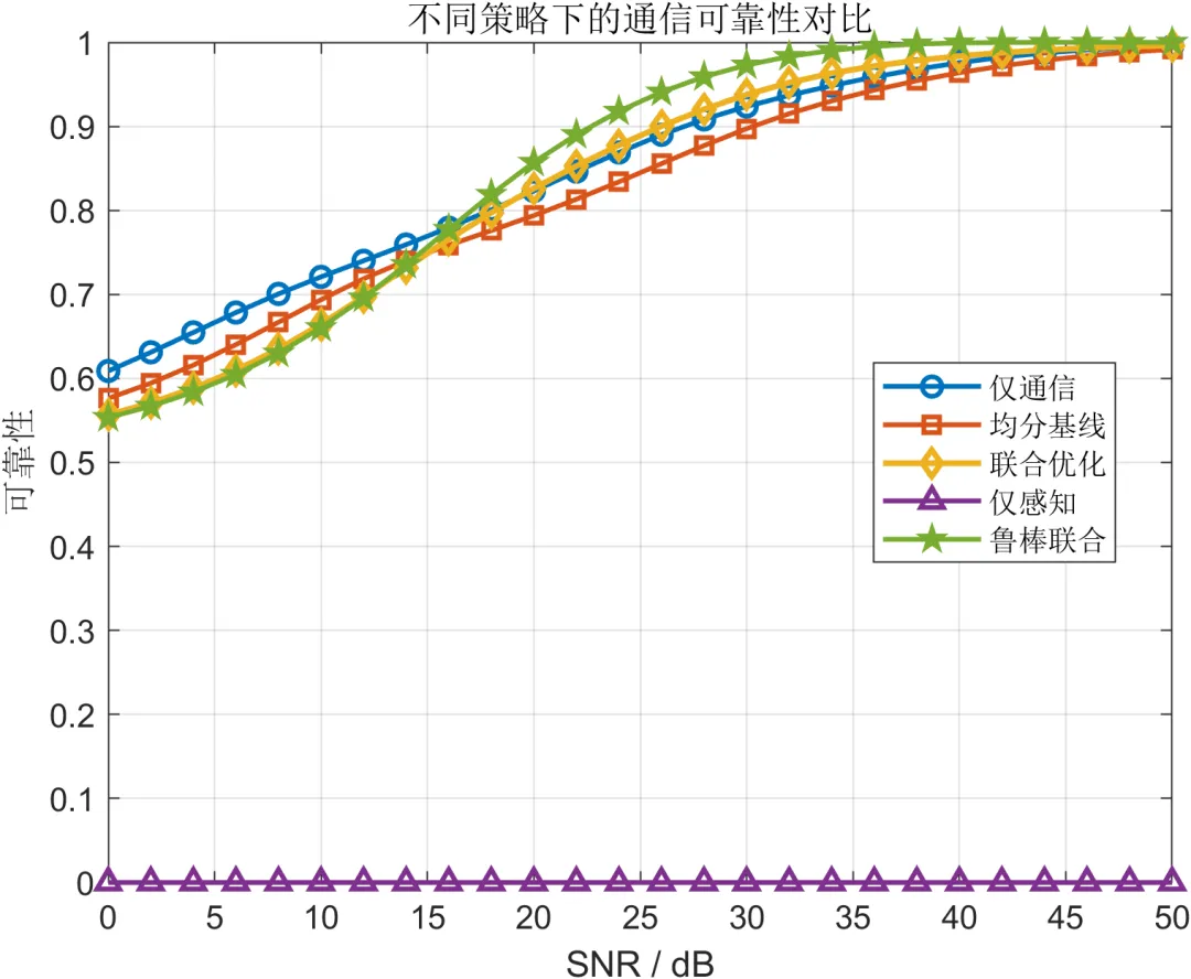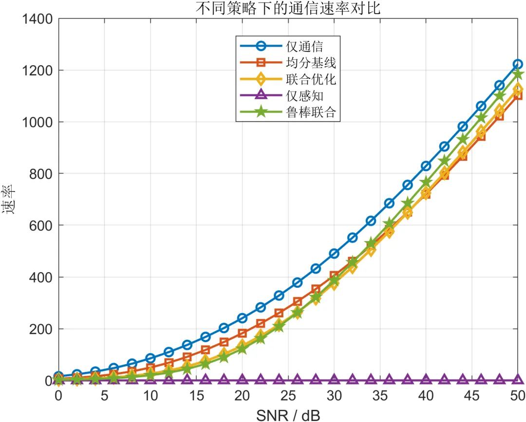 在性能评估方面,通信侧主要采用速率、可靠性和 BER 进行表征。速率反映系统的信息传输能力,可靠性体现链路在噪声和资源竞争条件下的可用程度,而 BER 则进一步刻画比特级别的传输正确性。感知侧则从角度估计、距离估计和速度估计三个维度进行分析,以更全面地描述系统的环境感知能力。为了避免单一指标带来的片面性,本文将上述指标统一纳入多策略对比框架,分别比较仅通信、均分基线、联合优化、仅感知以及鲁棒联合等多种方案在不同信噪比条件下的表现。