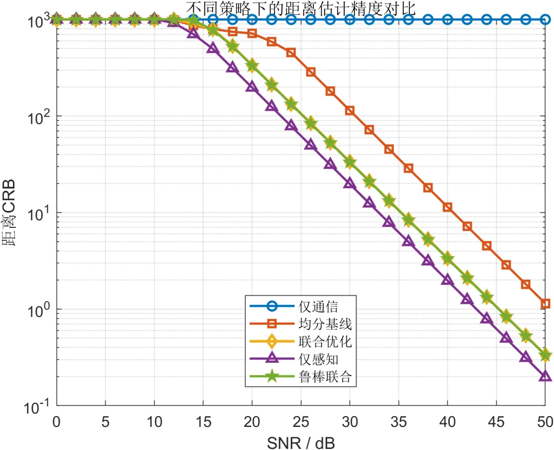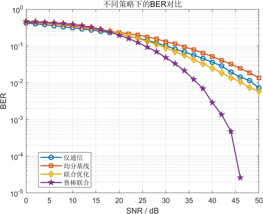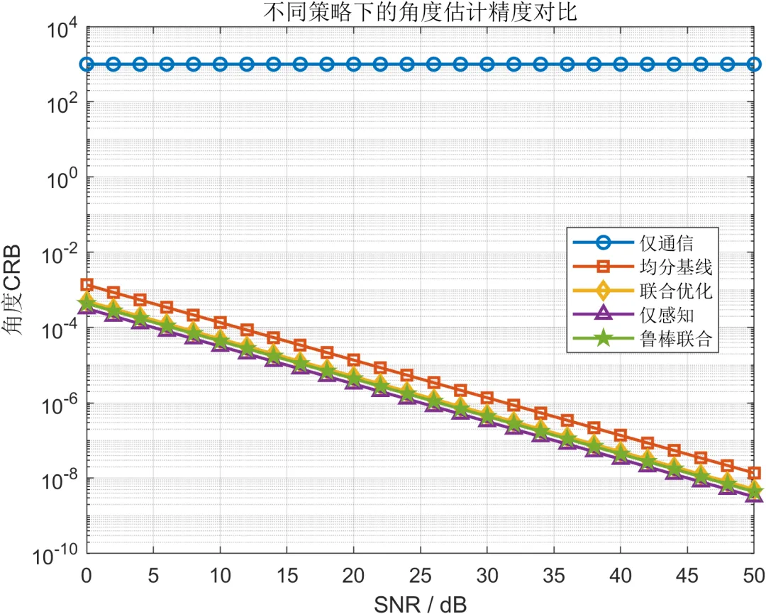 从 SNR 扫描结果来看,仅通信策略始终在通信速率和 BER 上占优,而仅感知策略在感知精度上表现最好,但二者都属于极端模式。均分基线虽然能够在通信和感知之间提供最直观的折中,但由于缺乏针对场景和指标的自适应设计,其综合表现并非最优。联合优化策略在多数情况下能够比均分基线获得更高的资源利用效率,使系统在速率、可靠性和多维感知精度之间形成更合理的平衡。鲁棒联合策略在理想条件下可能略微牺牲部分极限性能,但在角度失配条件下表现出更平滑的性能退化趋势,说明鲁棒设计确实增强了系统对模型不确定性的适应能力。