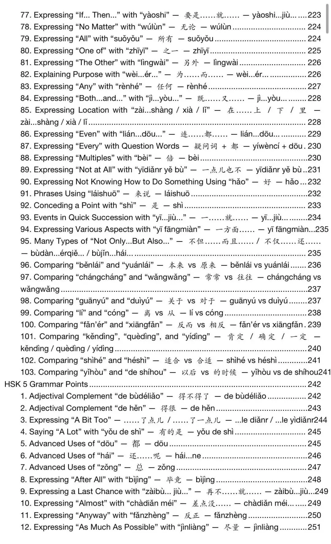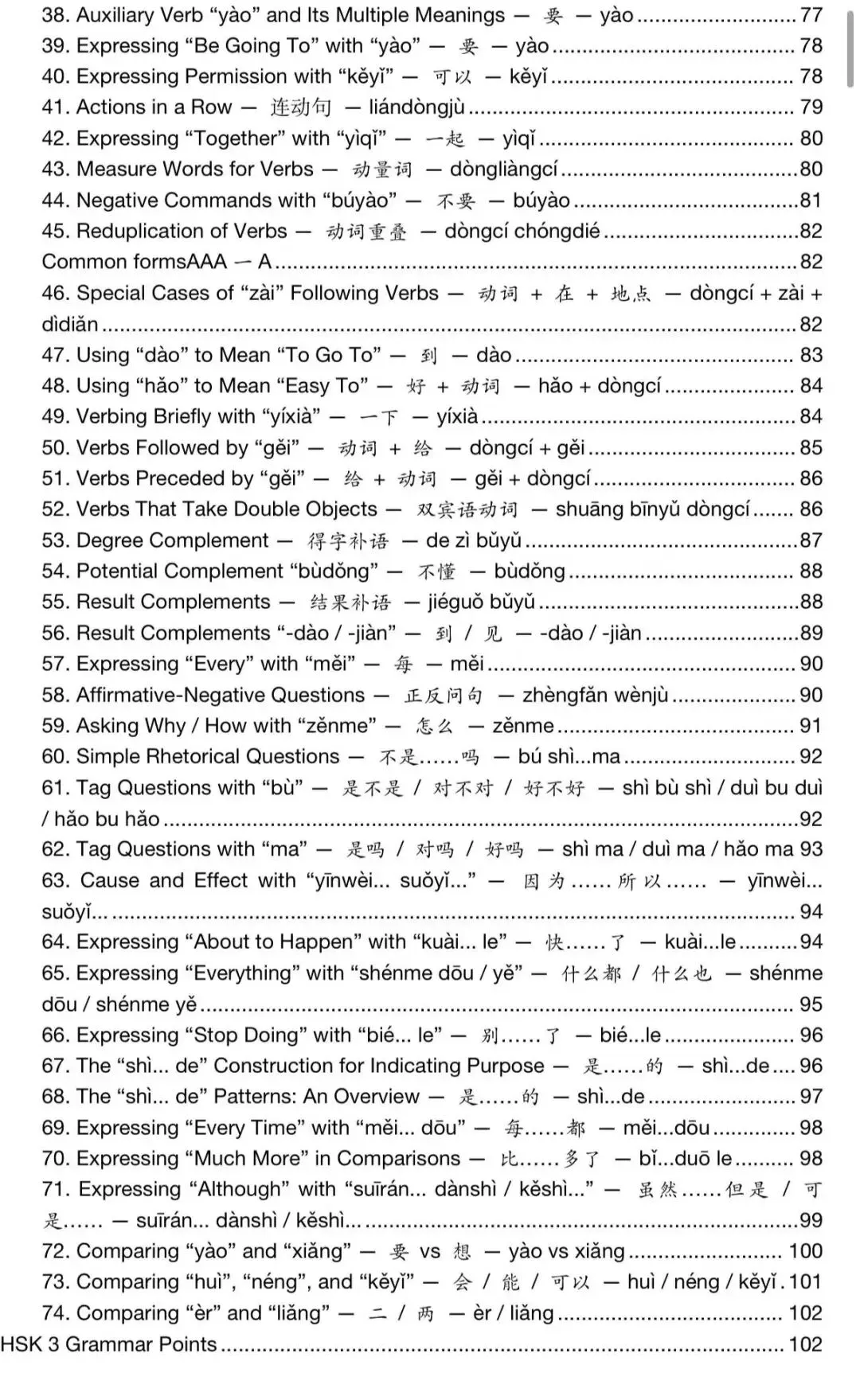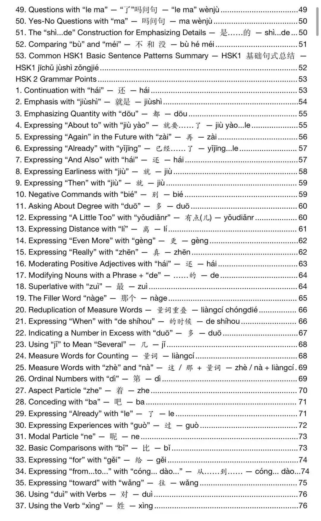 HSK 1: 53 grammar pointsHSK 2: 74 grammar pointsHSK 3: 86 grammar pointsHSK 4: 103 grammar pointsHSK 5: 138 grammar pointsHSK 6: 105 grammar points