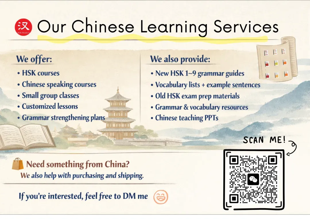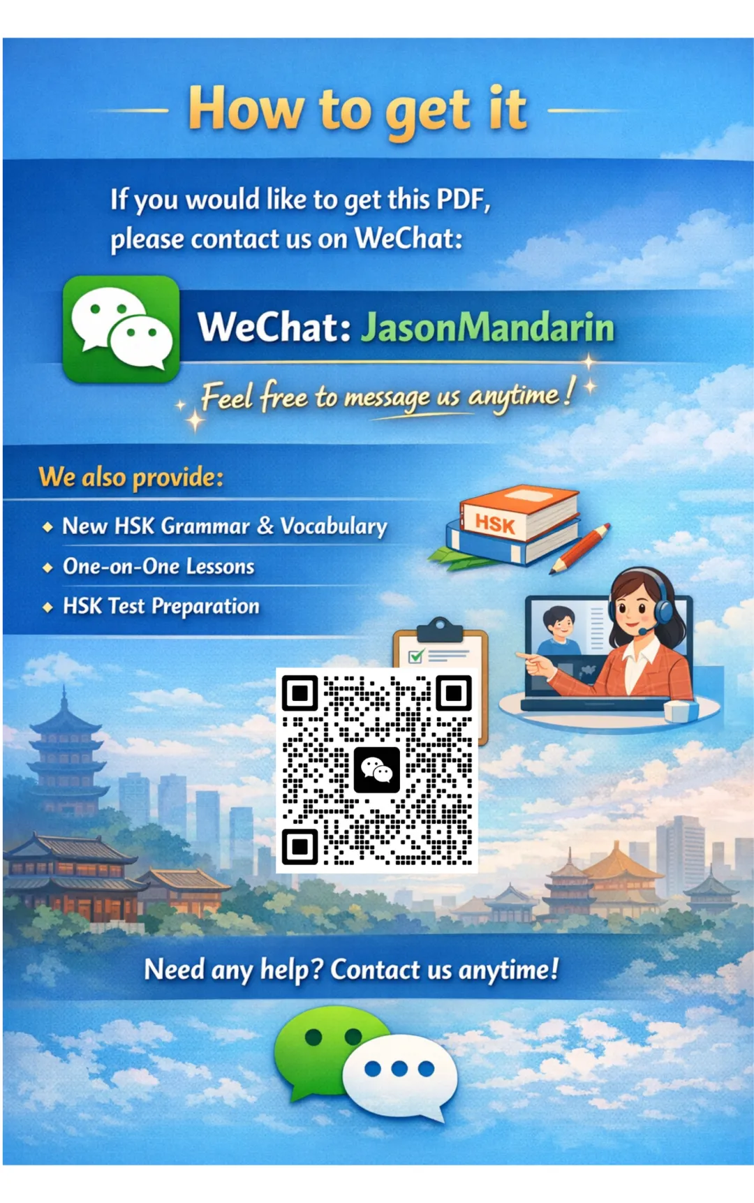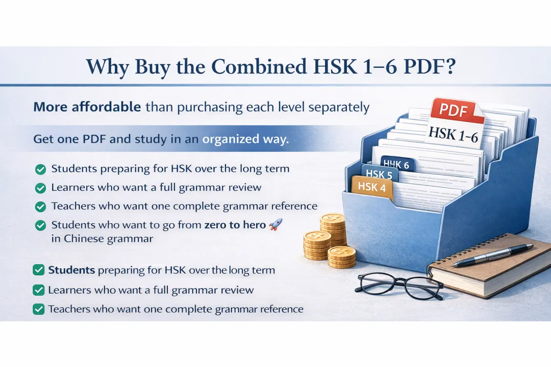 Now you do not need to buy or organize separate files level by level anymore. We have combined all HSK 1–6 grammar points into one PDF, making your grammar study much easier, clearer, and more systematic.
