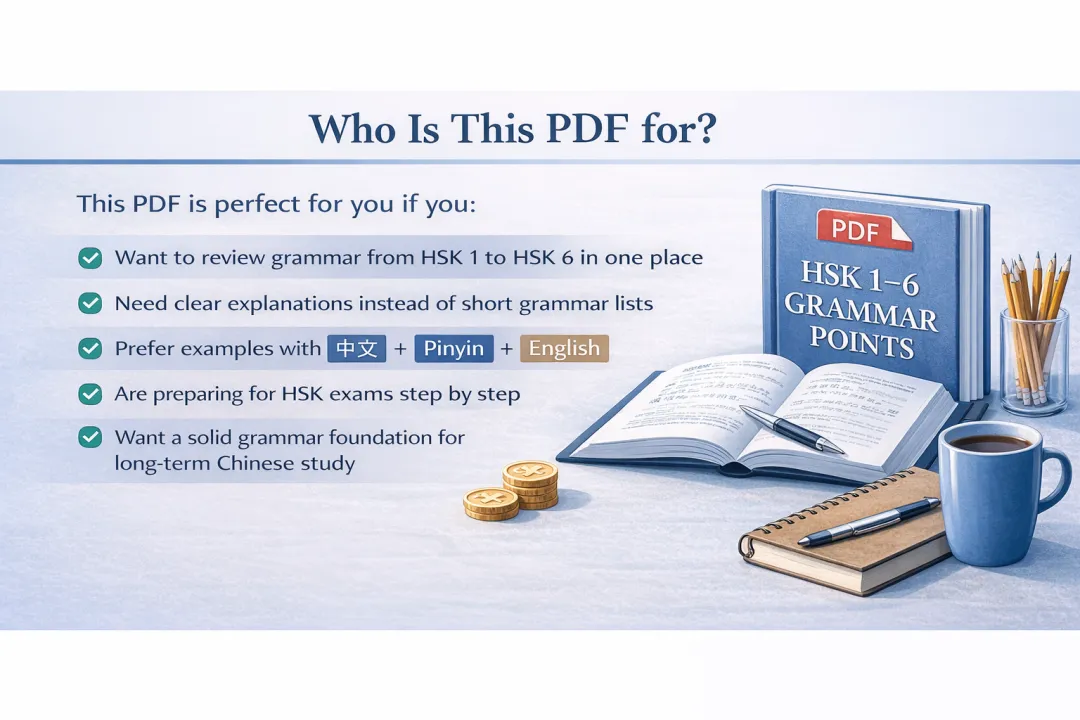 This full grammar PDF is especially helpful for learners who want to build a strong foundation, review grammar step by step, and prepare for long-term HSK study with one complete resource.