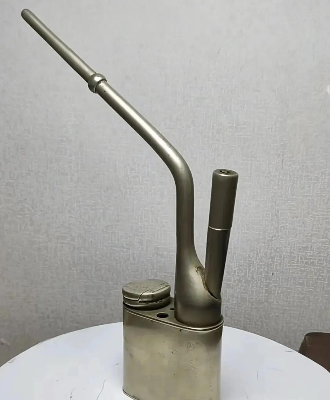 图里金灿灿的是个水烟袋,老一辈嗜烟的爷们离不开它,铜壶一个,烟锅藏在壶身边上,侧面拎出一根曲颈长嘴,装满水,烟丝先丢进锅,一点火,嘴巴对上烟管子慢慢吸,烟雾过水之后,进嘴不呛,滑得像一口牛奶,抽起来带着水声咕嘟咕嘟的