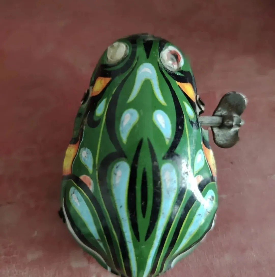 铁皮青蛙,八零后九零后的回忆刺青,铁皮壳子整得花花绿绿,身上画得像真青蛙一样窜动,那边顺时针给肚子旁的发条上紧,这个小家伙立马“咔哒咔哒”往前爬