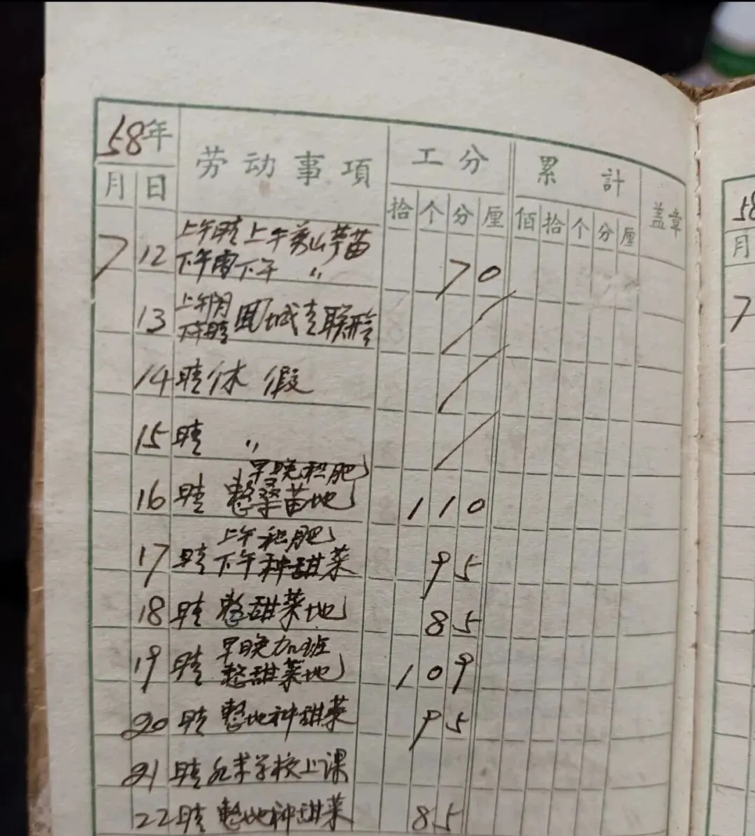 翻开一看,左一栏劳动项目,右一栏工分数,一笔一画写得认真,年底结算拿本子去队里换粮、换油、换柴火,这些泛黄的笔记本也算一个时代的证明,后来包产到户,工分本全进了抽屉底,现在年轻人见了基本摸不着头脑。