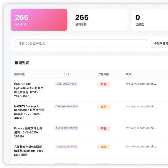 阿里云 AVD、长亭漏洞库、OSCS、奇安信 |多源实时漏洞监控和推送