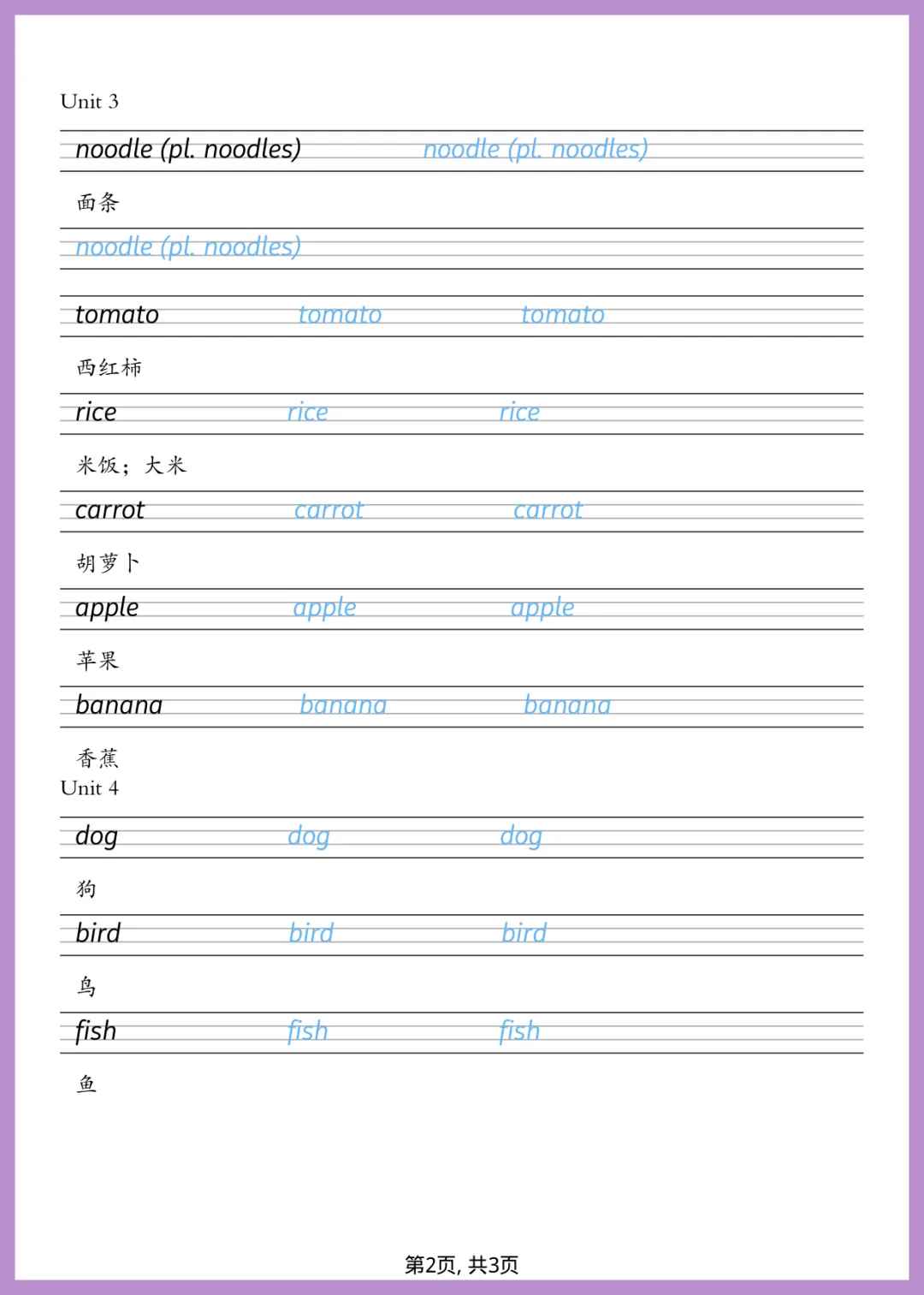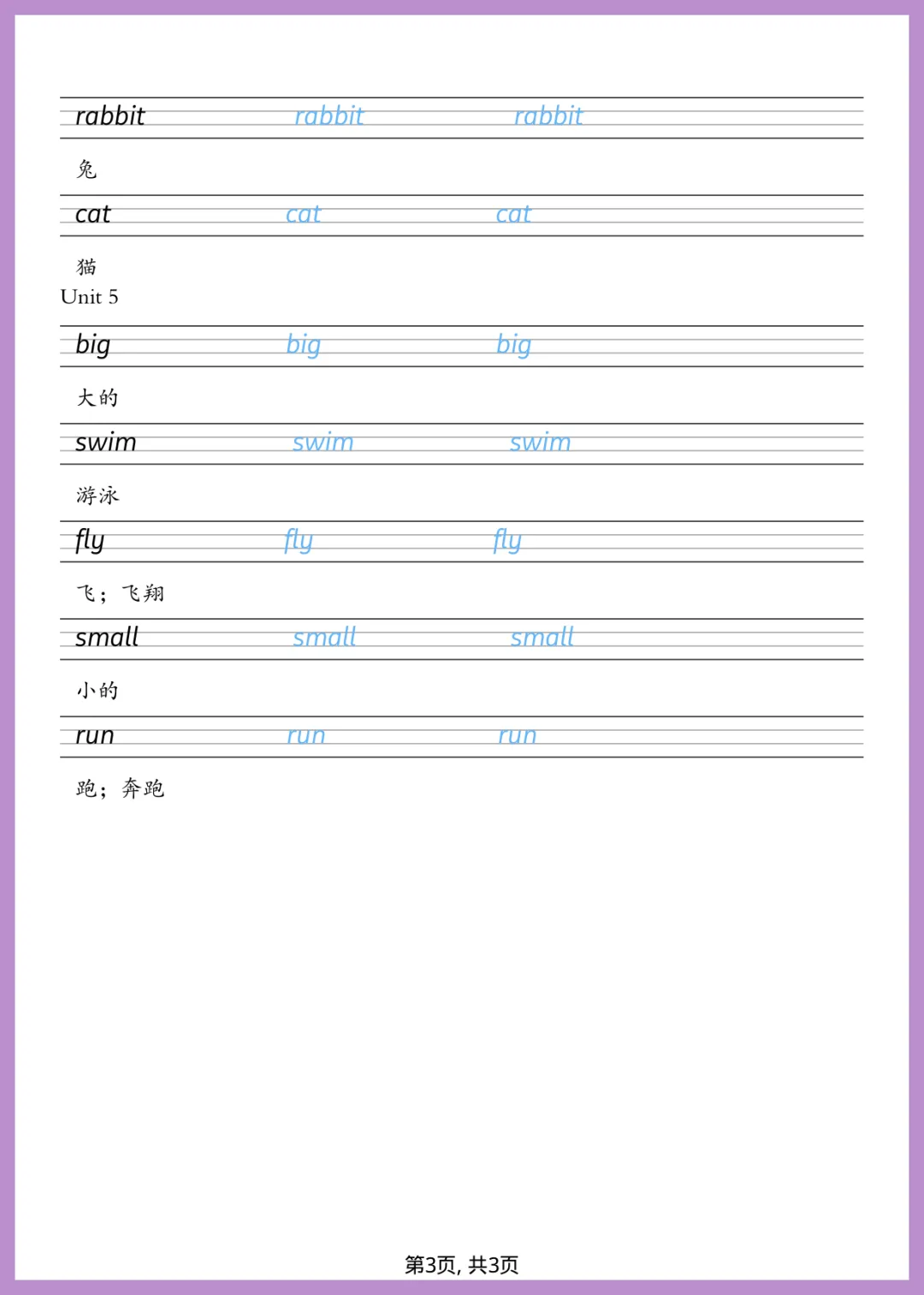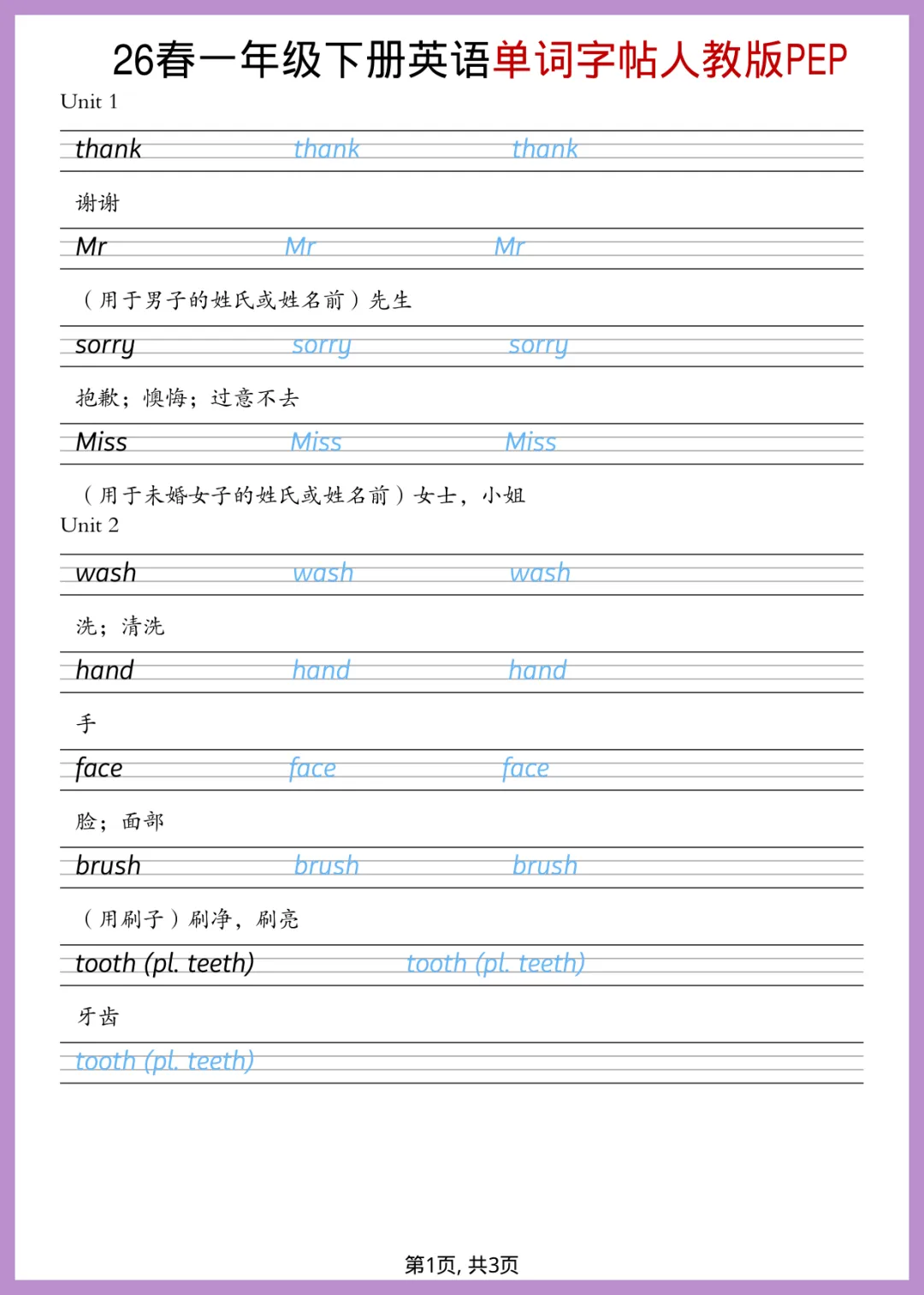 2026 年春季人教版一年级下册英语单词字帖来了!全套共 3 页,专为小朋友设计。这份字帖紧扣教材核心词汇,采用规范书写格式,让孩子在描红中轻松掌握单词拼写。每天练一练,不仅能规范英文手写体,还能加深记忆,为英语学习打下坚实基础,养成良好书写习惯。字迹工整,排版清晰,非常适合居家练习。想要孩子写得一手好英语的家长,赶紧打印出来给孩子练一练吧!