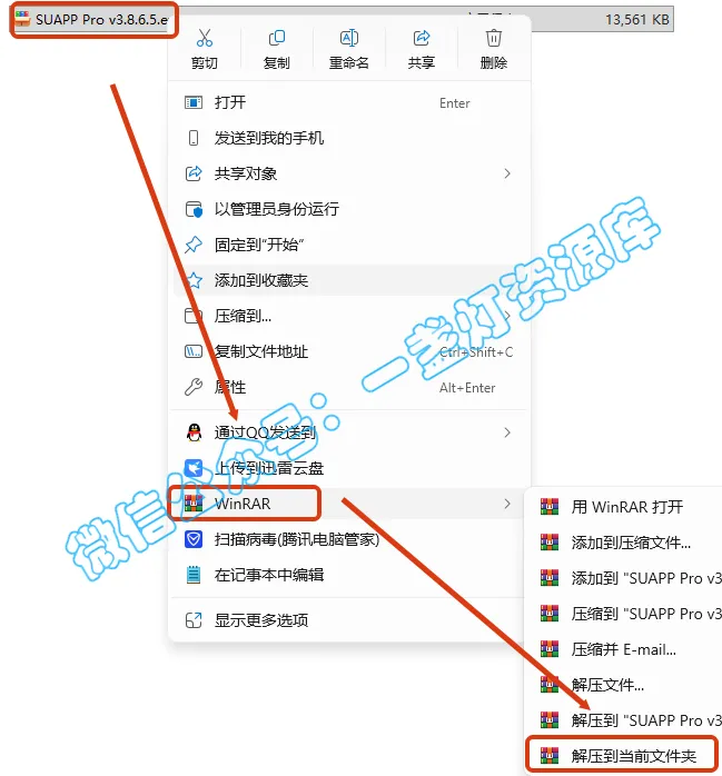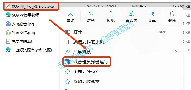 2.打开刚刚解压的文件夹,选中【SUAPP_Free_v3.8.6.5.exe】文件,鼠标右击选择【以管理员身份运行】