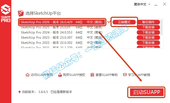 5.根据安装的SketchUp(草图大师)版本进行选择,点击【云端模式】切换成离线模式,