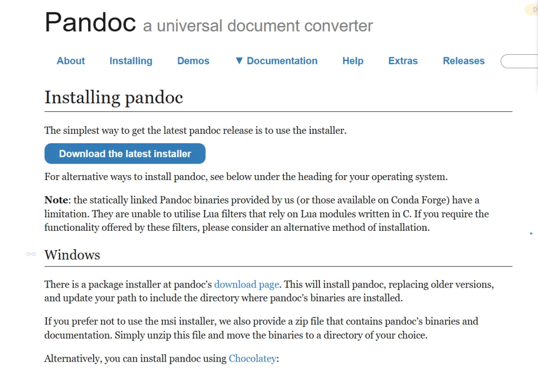 1. 首先从官网https://www.pandoc.org/installing.html下载pandoc安装包。我的系统是win10系统,下载如图1所示: