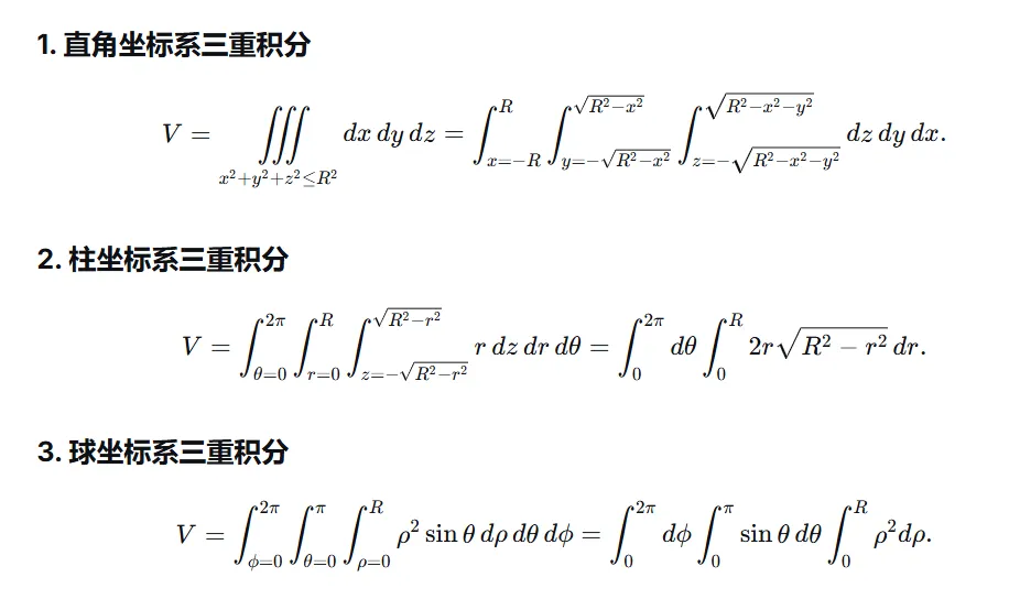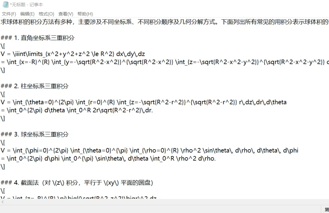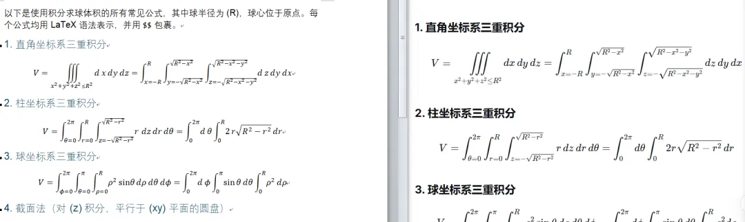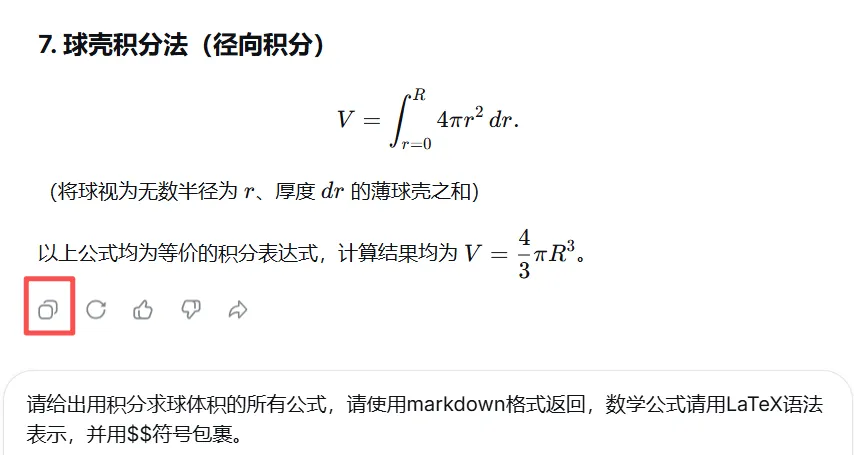 3. 然后用deepseek按照“请给出用积分求球体积的所有公式,请使用markdown格式返回,数学公式请用LaTeX语法表示,并用$$符号包裹。”提示词进行回答,deepseek给出很多数学公式,如图2