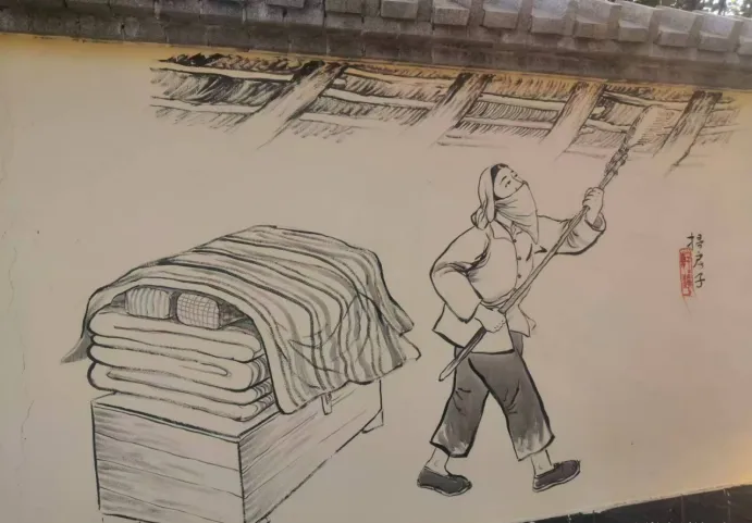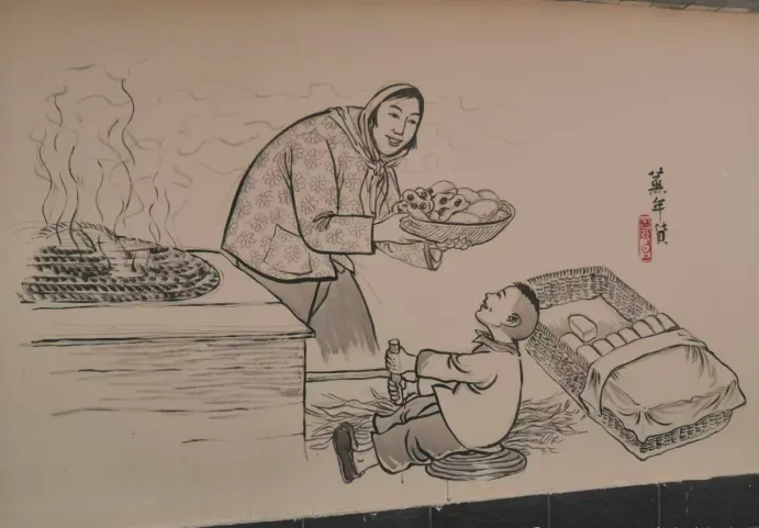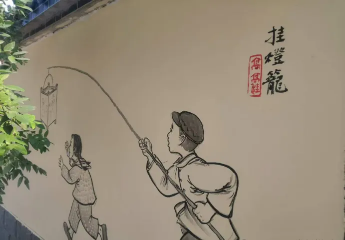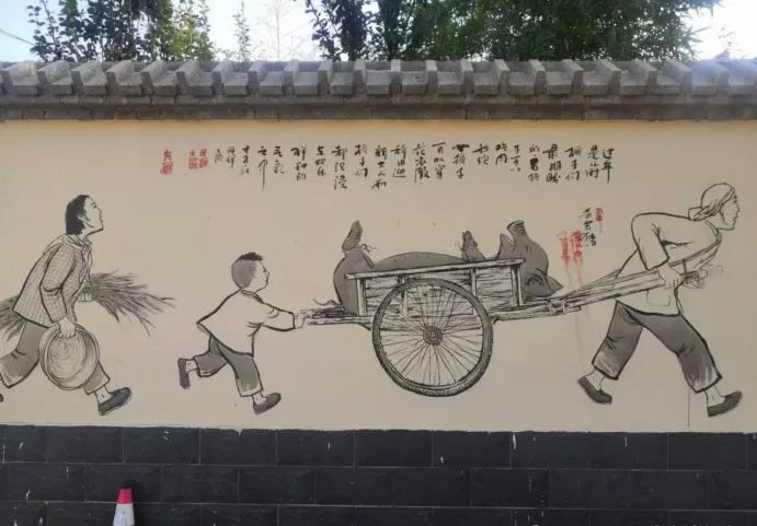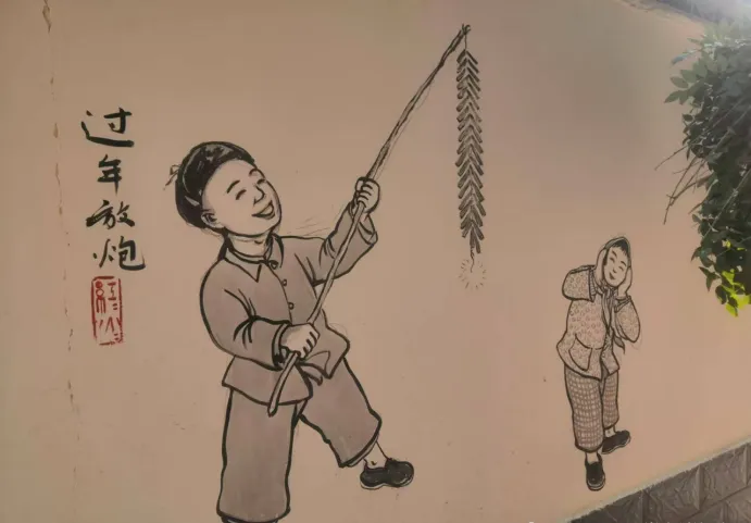 先说年味,这一面墙画得最有讲头,图中小孩儿手里举着的竹竿,每到腊月二十三一过,家里的鞭炮就开始备起来,最长的那串得大人帮忙挂,竹竿头上绑条麻绳,鞭炮挂高点小孩子抓不着,点起来劈里啪啦,气氛立马被烘得足,可别小看了这根竹竿,平时晒在屋檐下,过完年还得再收进柴房,明年继续用,小时候村里最盼的就是有个哥带着点炮,满村跑着比谁胆大,那个响声就像把年关给敲开了,现在听不到在家院子里乱点炮的动静,买来的礼炮图个新鲜,可那勾着绳子一排排点的架势,再也没人模仿。
