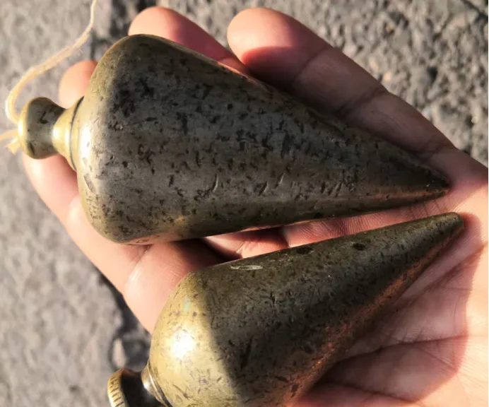 手里攥紧的一对小家伙,叫铜线坠,长得尖头圆肚,外头黄铜色,光泽不艳但老实,盖房子瓦匠拿它系上线,找墙垂直用的,小坠子下地不闲着,敲墙拉线都是靠它稳,小时候看师傅用铜坠一拉,线刚好碰着墙角,队长边上点头:“线坠用得准,墙起得正”,劲儿就在那根细线和重坠之间,手感沉实,可惜现在测垂直全电子仪器,铜坠成了展柜里头的年代符号,拿出来玩棱角都磨平了。