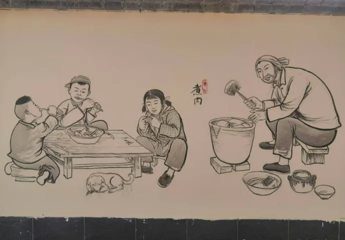 有场景的物件都离不开年集,墙上的画惟妙惟肖,猪上了架,推车的一家人往回赶,儿时最盼杀年猪,妈妈叫我别去凑太近,说地滑,一到村里杀猪,全村的人都围过去,锅里蒸着血糕,香气比啥都招人,杀完猪分肉,家家都拎着盆抢最快,那会儿的过年气,靠这些老物件和一锅年肉撑起来,现在谁还见得着活杀年猪,生肉超市里冰柜一翻全新鲜。