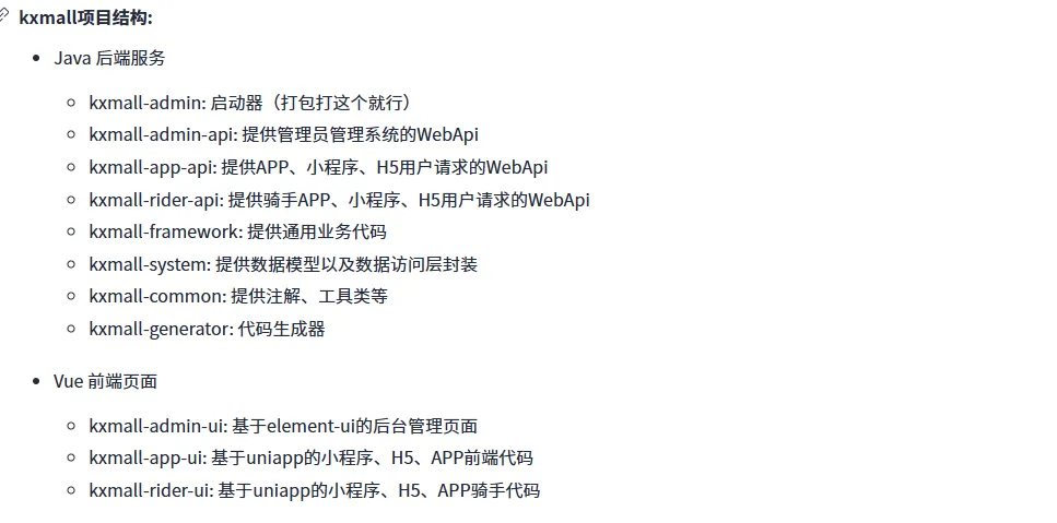 生鲜商城管理系统(含后台源码、小程序源码)。kxmall-生鲜商城+APP+小程序+H5同时支持微信小程序、H5、安卓App、苹果App。支持集群部署,单机部署。可用于B2C商城,O2O外卖,社区超市,生鲜【带配套骑手端配送系统】。kxmall使用uniapp编码。使用Java开发,SpringBoot 2.1.x框架,MyBatis-plus持久层框架、Redis作为缓存、MySql作为数据库。前端vuejs作为开发语言。