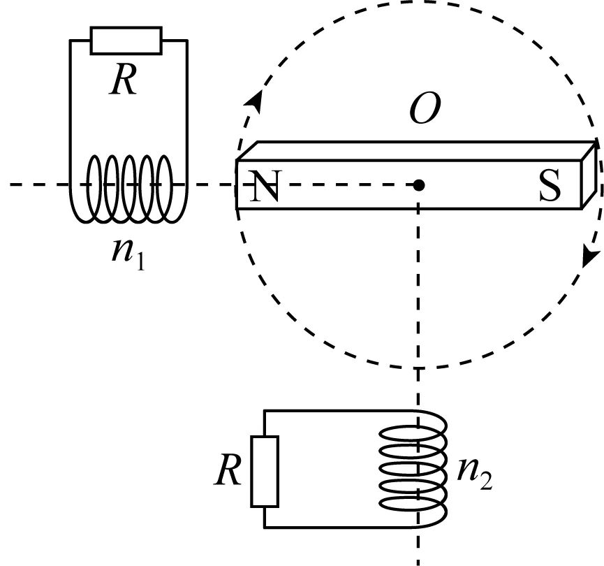 2. (2025·泰州期初)如图是简化的某种旋转磁极式发电机原理图.定子是仅匝数n不同的两线圈,n1>n2,二者轴线在同一平面内且相互垂直,两线圈到其轴线交点O的距离相等,且均连接阻值为R的电阻,转子是中心在O点的条形磁铁,绕O点在该平面内匀速转动时,两线圈输出正弦式交变电流.不计线圈电阻、自感及两线圈间的相互影响,下列说法中正确的是( )