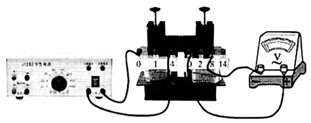 【解析】 感应线圈只适用于交流电源,直流电无法产生感应电流,A错误;如果拆去铁芯,线圈的自感系数下降,电压表的示数变小,B错误;将电源改接原线圈的“0”和“1”两个接线柱,原线圈的匝数将减小,而副线圈匝数不变,则电压表示数将变大,C正确;将电压表改接副线圈的“2”和“8”两个接线柱,负线圈的匝数将减小,而原线圈匝数不变,则电压表示数将变小,D错误.