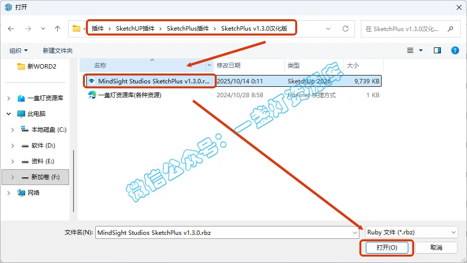 5.选择刚才解压的文件夹路径,选中【MindSight Studios SketchPlus v1.3.0.rbz】插件文件,点击【打开】