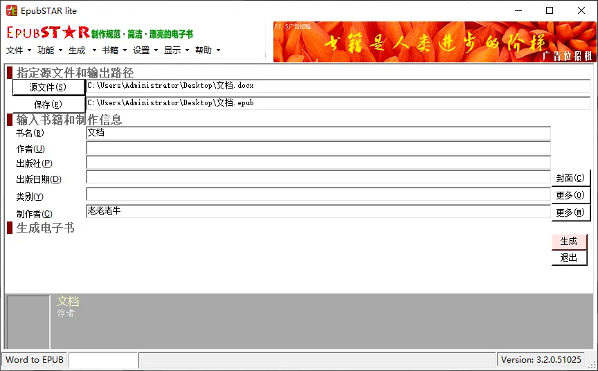 三步将文档转为epub电子书的软件 文档,即TXT或者word格式,转epub格式的工具有很多,转出来的效果,也有不同。 今天我给大家介绍一款老式的软件:EpubSTAR 图标如下: TXT纯文本格式不用说,转epub格式非常简单。 那么,假设有表格、图片等内容的文档呢? 如图: 我们首先打开EpubSTAR,如图: 1、选择“源文件”按钮,将要转换的文档导入,输入:书名、作者、出版社、出版日期、类别、制作者等信息(当然,不填写也可以) 2、点击“生成”按钮,一个EPUB电子书就诞生了。 诞生后的epub里,表格内容如下: 他会自动生成表格的代码,无需额外操作,简单省事。