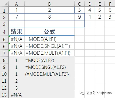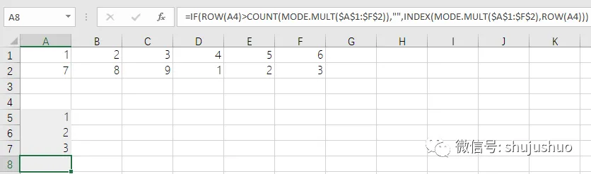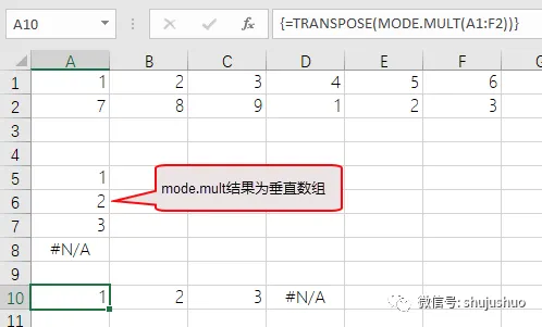 使用transpose函数将垂直数组转水平数组。A10单元格公式为“=TRANSPOSE(MODE.MULT(A1:F2))”操作上相同,仍然是先选中区域,再按下ctrl+shift+enter组合键生效。