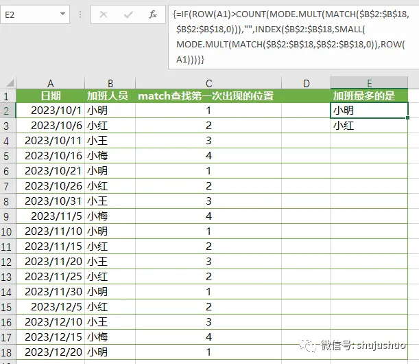组织里总是有人做得多得到的少,做得少得到的多,示例中,领导需要统计一下加班次数最多的人。次数最多,就是众数,可是mode三兄弟函数都支持对数值计算,对姓名文本却无能为力。