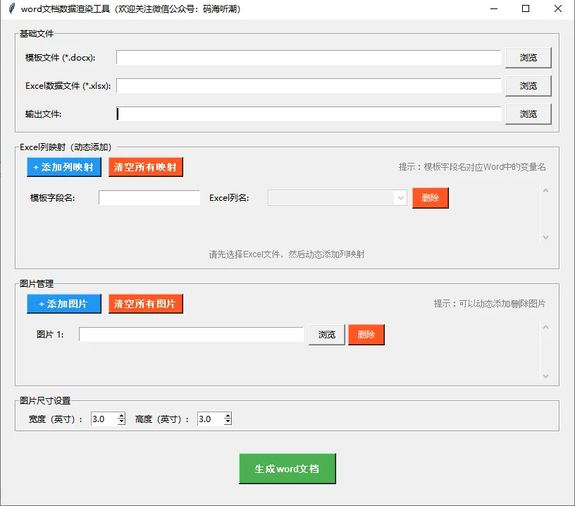 import tkinter as tkfrom tkinter import filedialog, messagebox, ttkclass QualityFeedbackApp:def __init__(self, root):self.root = rootself.root.title("Word模板渲染工具(欢迎关注微信公众号:码海听潮)")self.root.geometry("900x750")# 存储文件路径的变量self.template_path = tk.StringVar()self.excel_path = tk.StringVar()self.output_path = tk.StringVar(value="result.docx")# 存储动态图片路径的列表self.image_paths = []self.image_frames = []# 存储动态列映射的列表self.column_mappings = [] # 存储 (模板字段名, Excel列名, 框架)self.column_frames = []# 存储Excel列名self.available_columns = []# 设置默认输出路径self.output_path.set(os.path.join(os.getcwd(), "result.docx"))# 创建界面self.create_widgets()def create_widgets(self):# 创建主框架main_frame = tk.Frame(self.root)main_frame.pack(pady=10, padx=20, fill=tk.BOTH, expand=True)# 基础文件选择框架base_frame = tk.LabelFrame(main_frame, text="基础文件", padx=10, pady=5)base_frame.pack(fill=tk.X, pady=(0,10))# 模板文件选择self.create_file_row(base_frame, "模板文件 (*.docx):",self.template_path, self.select_template, 0)# Excel数据文件选择self.create_file_row(base_frame, "Excel数据文件 (*.xlsx):",self.excel_path, self.select_excel, 1)# 输出文件self.create_file_row(base_frame, "输出文件:", self.output_path,self.select_output, 2)# Excel列映射框架columns_frame = tk.LabelFrame(main_frame, text="Excel列映射(动态添加)", padx=10, pady=5)columns_frame.pack(fill=tk.X, pady=(0,10))# 列映射按钮框架columns_btn_frame = tk.Frame(columns_frame)columns_btn_frame.pack(pady=(0,10), fill=tk.X)add_column_btn = tk.Button(columns_btn_frame, text="+ 添加列映射",command=self.add_column_row,bg="#2196F3", fg="white",font=("Arial", 10, "bold"),width=12)add_column_btn.pack(side=tk.LEFT, padx=5)remove_all_columns_btn = tk.Button(columns_btn_frame, text="清空所有映射",command=self.remove_all_columns,bg="#FF5722", fg="white",font=("Arial", 10, "bold"),width=12)remove_all_columns_btn.pack(side=tk.LEFT, padx=5)# 列映射提示标签columns_tip_label = tk.Label(columns_btn_frame, text="提示:模板字段名对应Word中的变量名",fg="gray", font=("Arial", 9))columns_tip_label.pack(side=tk.RIGHT, padx=5)# 列映射列表显示区域columns_list_frame = tk.Frame(columns_frame)columns_list_frame.pack(fill=tk.BOTH, expand=True)# 创建Canvas和滚动条columns_canvas = tk.Canvas(columns_list_frame, height=80)columns_scrollbar = tk.Scrollbar(columns_list_frame, orient="vertical", command=columns_canvas.yview)self.columns_scrollable_frame = tk.Frame(columns_canvas)self.columns_scrollable_frame.bind("<Configure>",lambda e: columns_canvas.configure(scrollregion=columns_canvas.bbox("all")))columns_canvas.create_window((0, 0), window=self.columns_scrollable_frame, anchor="nw")columns_canvas.configure(yscrollcommand=columns_scrollbar.set)columns_canvas.pack(side="left", fill="both", expand=True)columns_scrollbar.pack(side="right", fill="y")self.columns_container = self.columns_scrollable_frame# 列状态标签self.columns_status_label = tk.Label(columns_frame, text="请先选择Excel文件,然后动态添加列映射",fg="gray", font=("Arial", 9))self.columns_status_label.pack(pady=5)# 图片管理框架images_frame = tk.LabelFrame(main_frame, text="图片管理", padx=10, pady=5)images_frame.pack(fill=tk.BOTH, expand=True, pady=(0,10))# 按钮框架 - 放在图片管理框架顶部btn_frame = tk.Frame(images_frame)btn_frame.pack(pady=(0,10), fill=tk.X)add_image_btn = tk.Button(btn_frame, text="+ 添加图片",command=self.add_image_row,bg="#2196F3", fg="white",font=("Arial", 10, "bold"),width=12)add_image_btn.pack(side=tk.LEFT, padx=5)remove_all_btn = tk.Button(btn_frame, text="清空所有图片",command=self.remove_all_images,bg="#FF5722", fg="white",font=("Arial", 10, "bold"),width=12)remove_all_btn.pack(side=tk.LEFT, padx=5)# 图片提示标签tip_label = tk.Label(btn_frame, text="提示:可以动态添加/删除图片",fg="gray", font=("Arial", 9))tip_label.pack(side=tk.RIGHT, padx=5)# 图片列表显示区域images_list_frame = tk.Frame(images_frame)images_list_frame.pack(fill=tk.BOTH, expand=True)# 创建Canvas和滚动条images_canvas = tk.Canvas(images_list_frame, height=80)images_scrollbar = tk.Scrollbar(images_list_frame, orient="vertical", command=images_canvas.yview)self.images_scrollable_frame = tk.Frame(images_canvas)self.images_scrollable_frame.bind("<Configure>",lambda e: images_canvas.configure(scrollregion=images_canvas.bbox("all")))images_canvas.create_window((0, 0), window=self.images_scrollable_frame, anchor="nw")images_canvas.configure(yscrollcommand=images_scrollbar.set)images_canvas.pack(side="left", fill="both", expand=True)images_scrollbar.pack(side="right", fill="y")self.image_container = self.images_scrollable_frame# 图片尺寸设置框架size_frame = tk.LabelFrame(main_frame, text="图片尺寸设置", padx=10, pady=5)size_frame.pack(fill=tk.X, pady=(0,10))tk.Label(size_frame, text="宽度(英寸):").pack(side=tk.LEFT, padx=5)self.image_width = tk.StringVar(value="3")width_spinbox = tk.Spinbox(size_frame, from_=0.5, to=10, increment=0.5,textvariable=self.image_width, width=5)width_spinbox.pack(side=tk.LEFT, padx=5)tk.Label(size_frame, text="高度(英寸):").pack(side=tk.LEFT, padx=5)self.image_height = tk.StringVar(value="3")height_spinbox = tk.Spinbox(size_frame, from_=0.5, to=10, increment=0.5,textvariable=self.image_height, width=5)height_spinbox.pack(side=tk.LEFT, padx=5)# 生成按钮self.generate_btn = tk.Button(main_frame, text="生成word文档",command=self.generate_report,bg="#4CAF50", fg="white",font=("Arial", 10, "bold"),height=2, width=16)self.generate_btn.pack(pady=20)# 初始化时添加一个默认列映射和默认图片行self.add_column_row()self.add_image_row()def create_file_row(self, parent, label_text, variable, command, row):"""创建文件选择行"""tk.Label(parent, text=label_text, width=18, a
