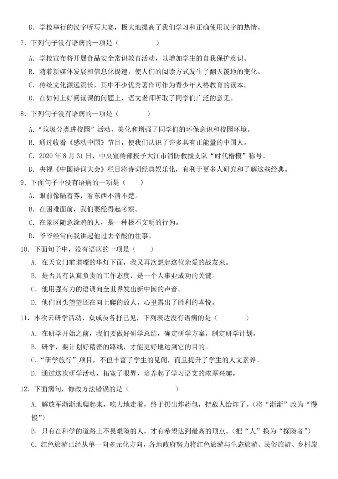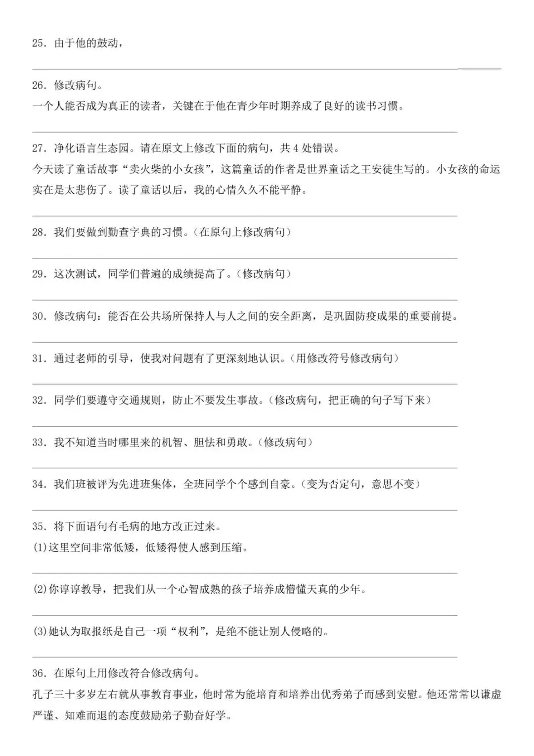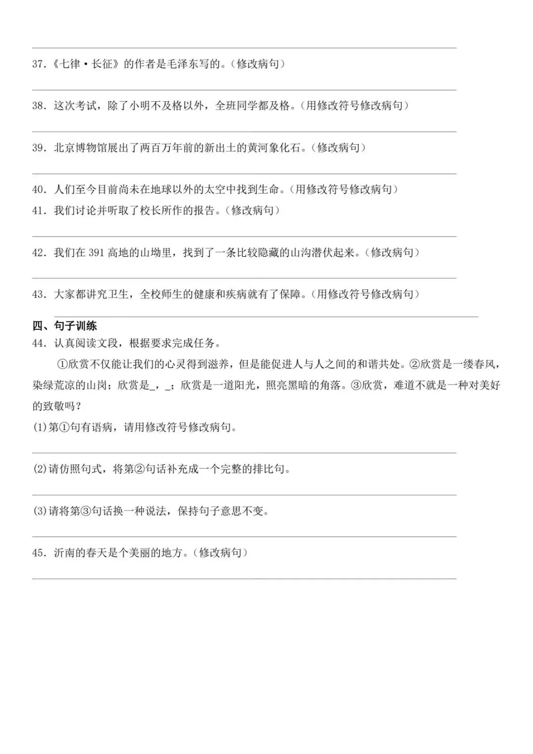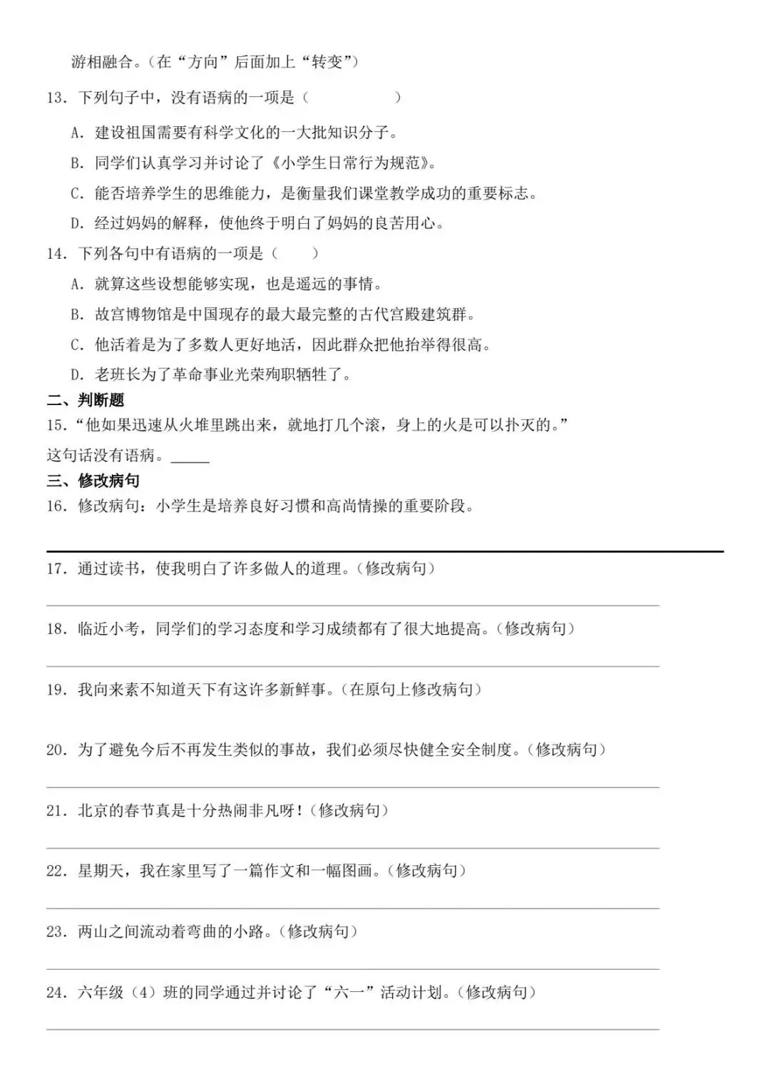 小升初语文新题型病句修改专项练习(电子版可打印附答案)