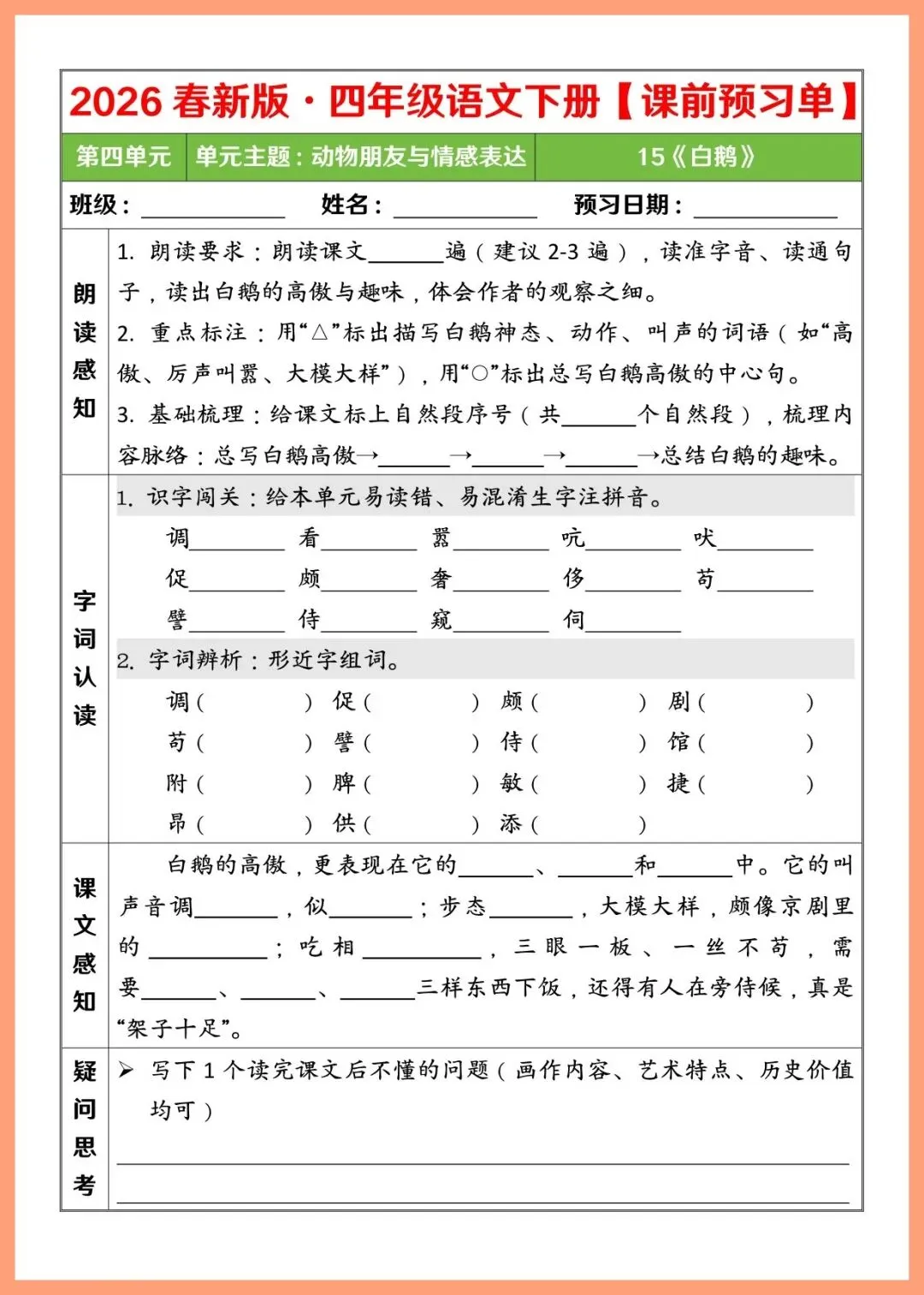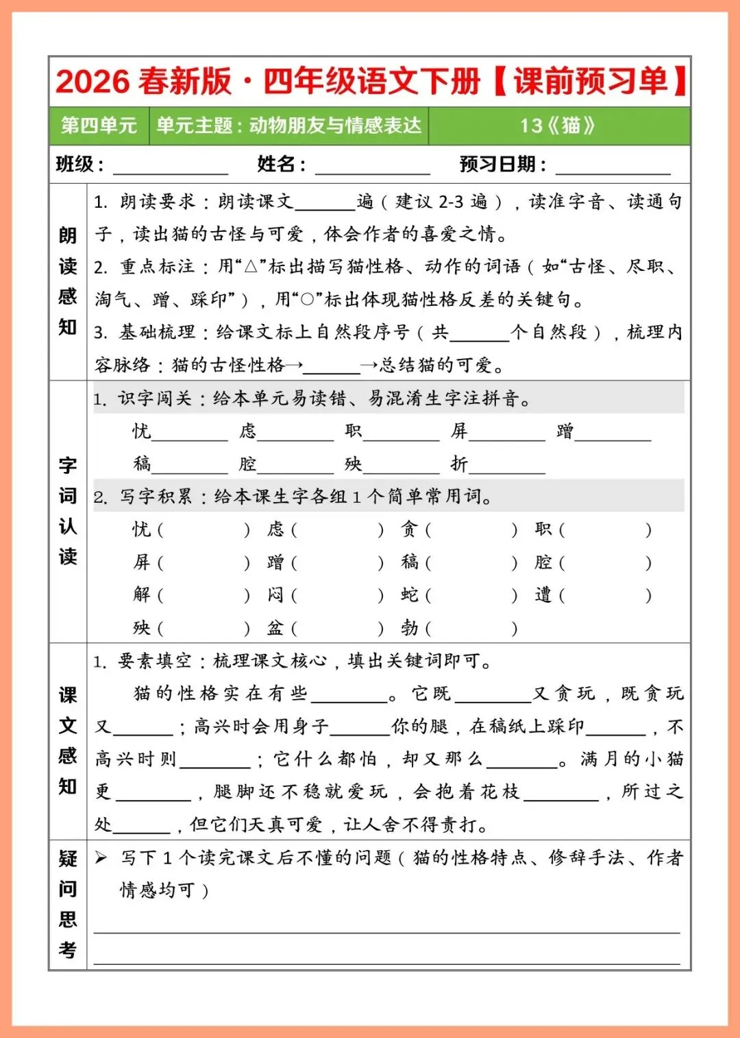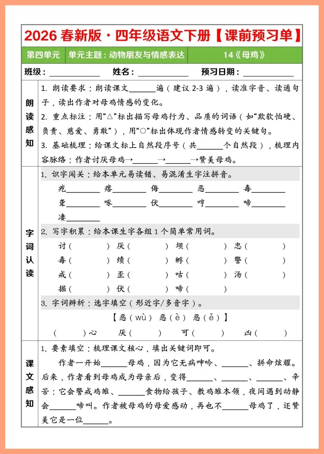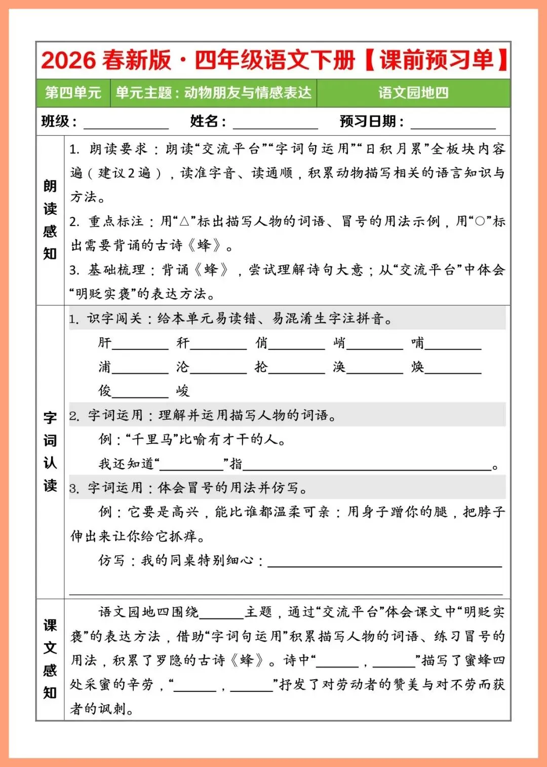 四年级(下)语文_26春第四单元课前预习单,共4页,电子版可打印可下载。这份资料内容丰富,结构清晰,包含了核心知识点和练习题,帮助孩子巩固学习成果,及时发现不足之处,查缺补漏。有需要的家长抓紧打印出来给孩子练一练吧!