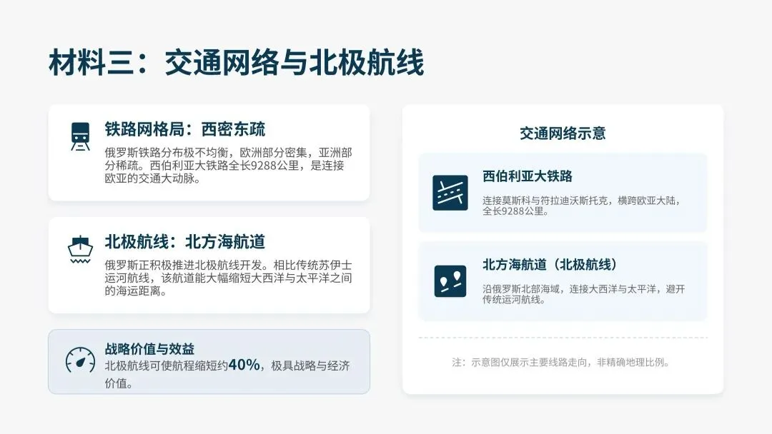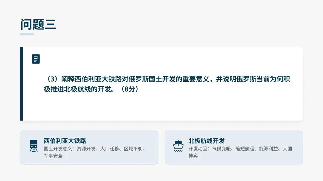 (3)阐释西伯利亚大铁路对俄罗斯国土开发的重要意义,并说明俄罗斯当前为何积极推进北极航线的开发。(8分)
