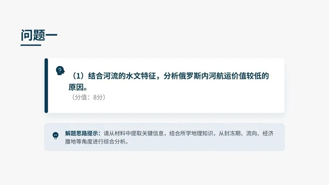 本题考查水文特征与区域发展的关系。航运价值高低需从自然条件(通航时间、流速、流量) 和社会经济需求(流向与腹地经济匹配度) 两方面综合判断。俄罗斯河流“大而冷、北向流”的特点,使其天然不具备内河航运优势。