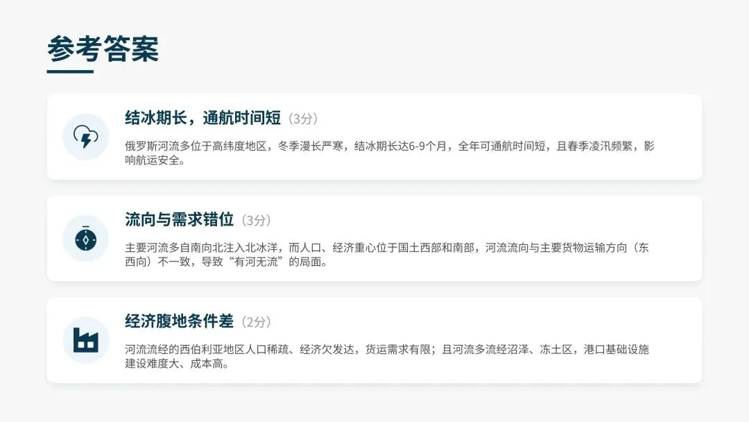 (1)1️⃣结冰期长,通航时间短:俄罗斯河流多位于高纬度地区,冬季漫长严寒,结冰期长达6-9个月,全年可通航时间短,且春季凌汛频繁,影响航运安全。(3分)